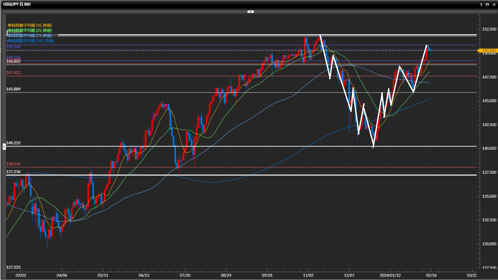 直近安値は145.89円。米国CPIの上振れで一気に150円台後半まで上昇。