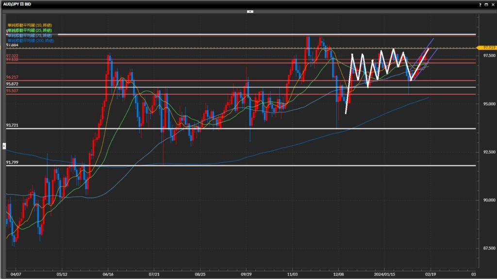 日足の直近高値161.87円目前のため、基本は様子見。 - 豪ドル円は日足はレンジ、4時間足〜1時間足は上目線。