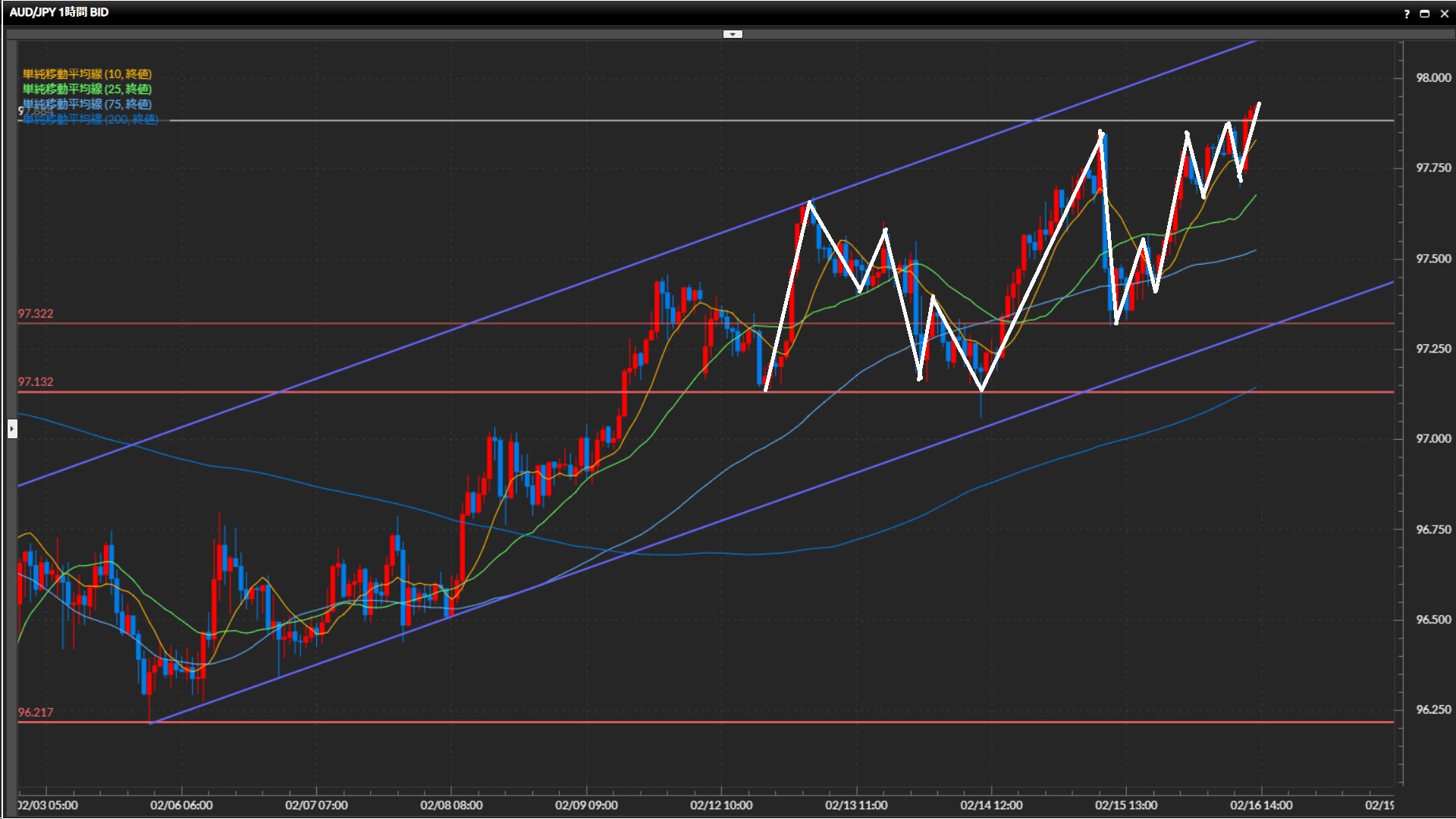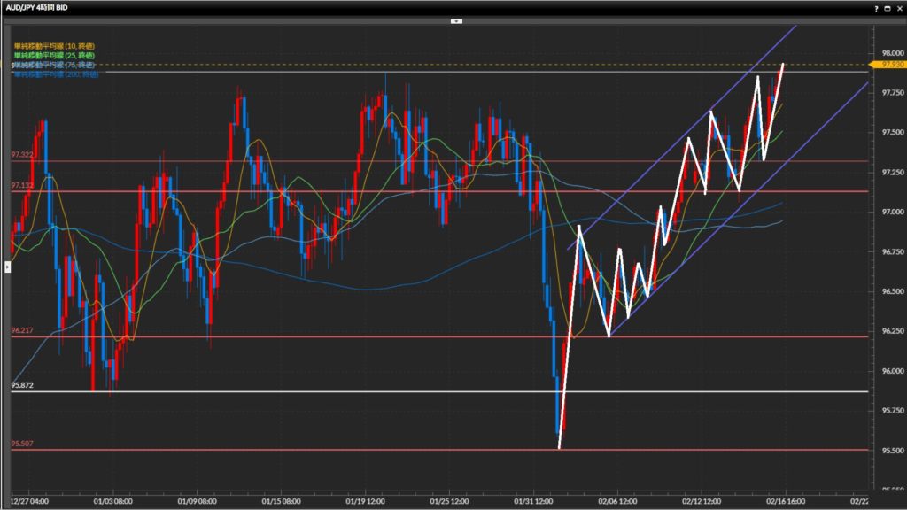 水平線97.88円の上抜けチャレンジ中。直近の波で下目線になったにも関わらず高値を更新する辺りに、水平線の機能していなさが窺える。