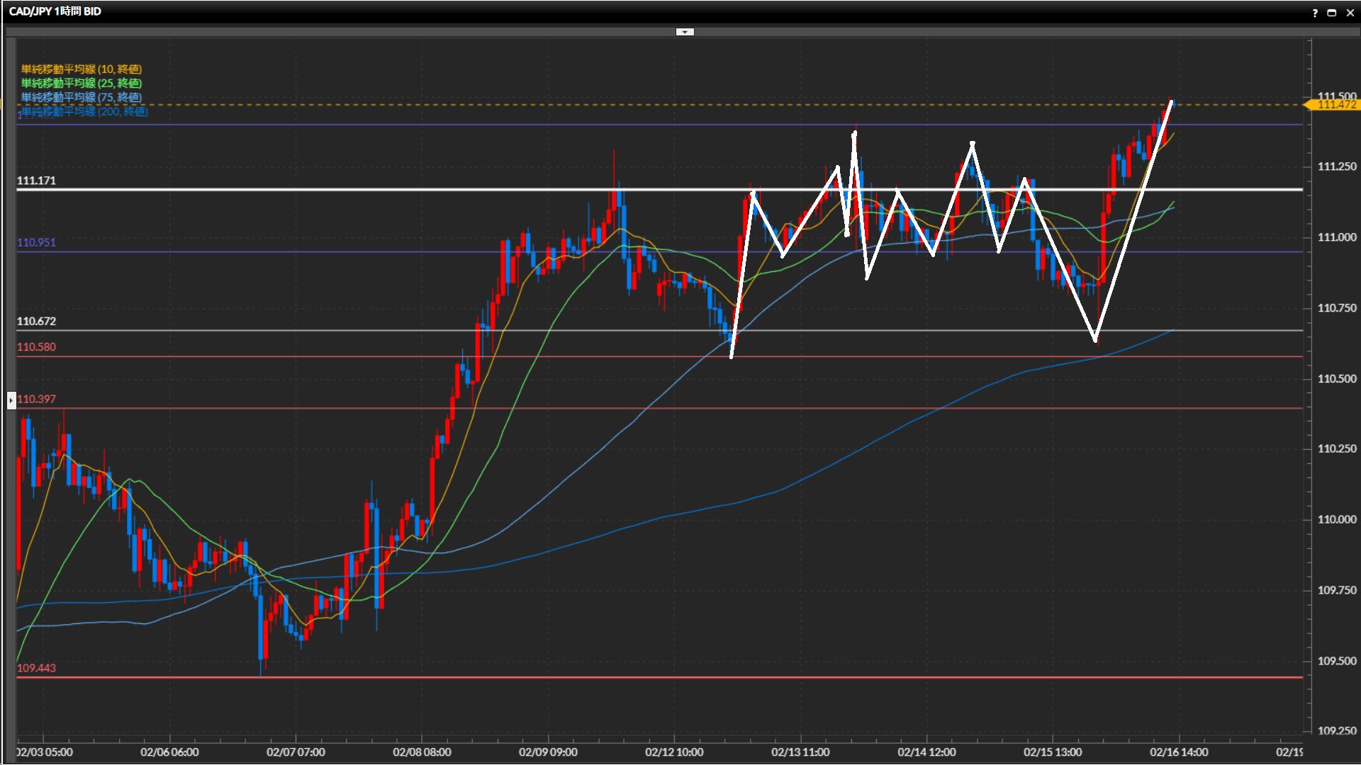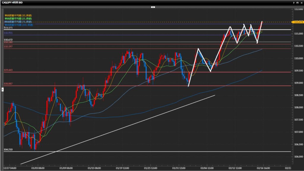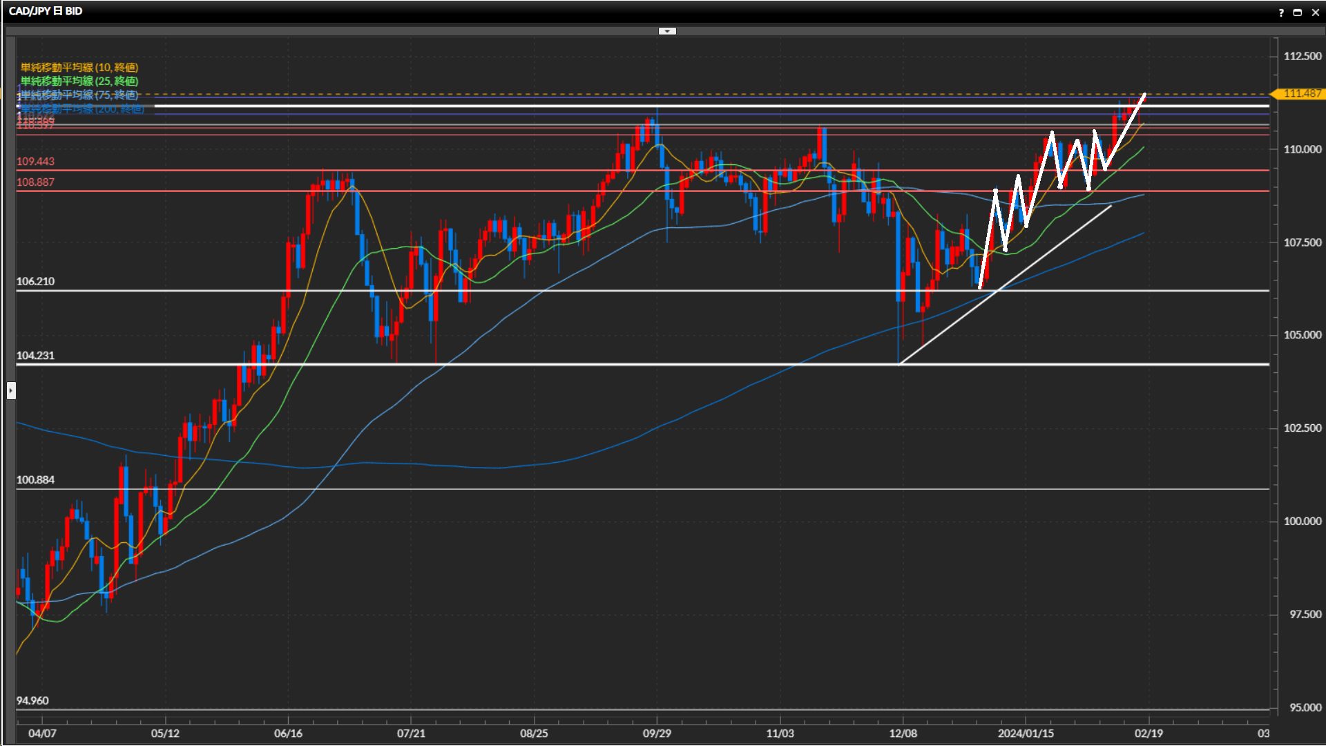 直近安値は109.44円。日足最高値111.17円を上抜け確定。