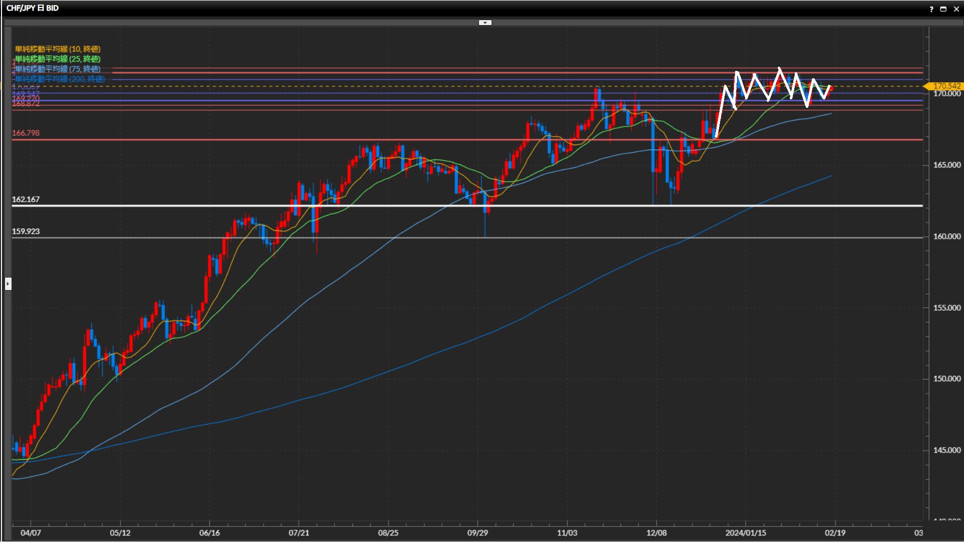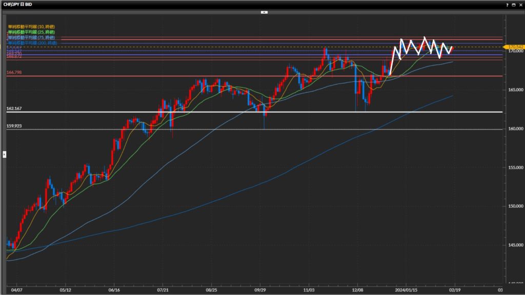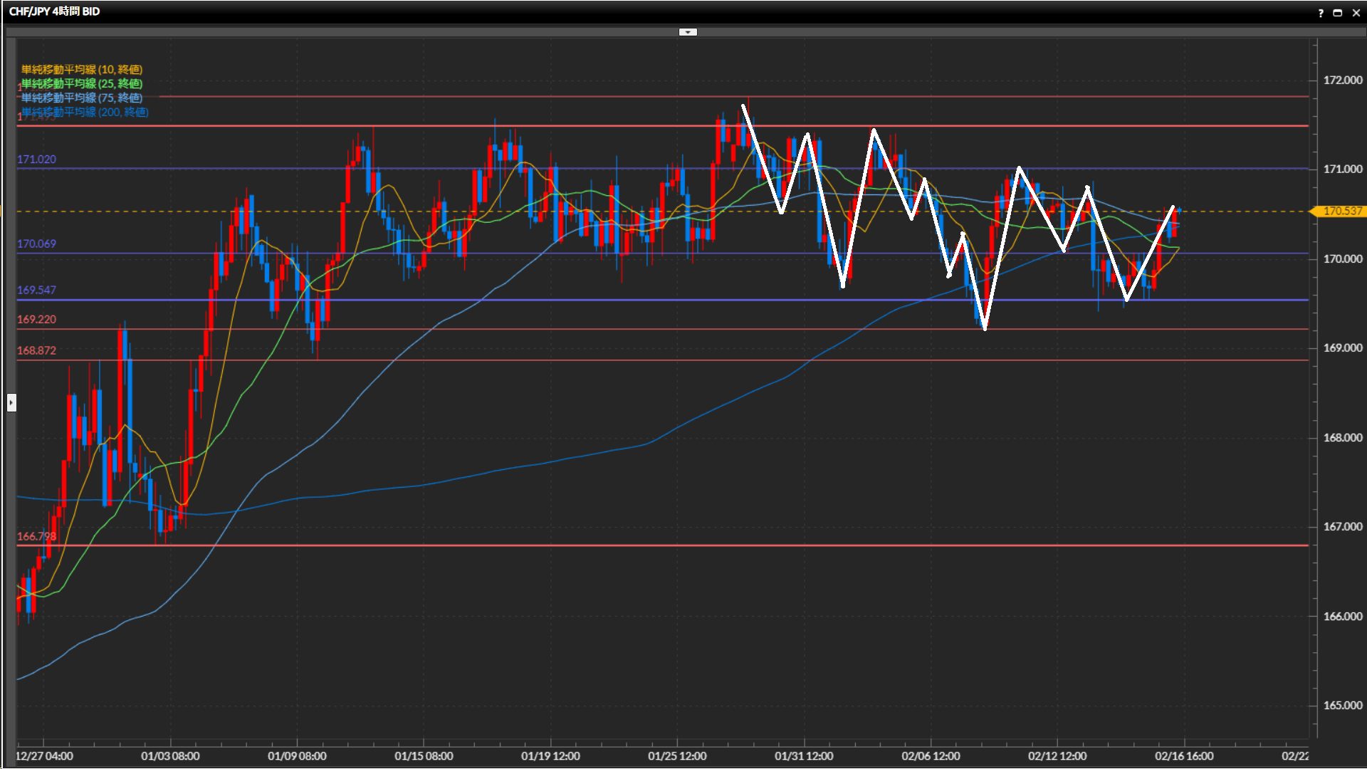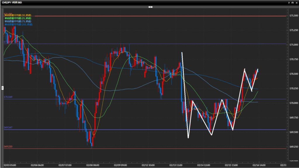 2回高値を形成した水平線170.70円を上抜け、安値を170.19円まで切上げ。目線の定まらない動きが継続中。