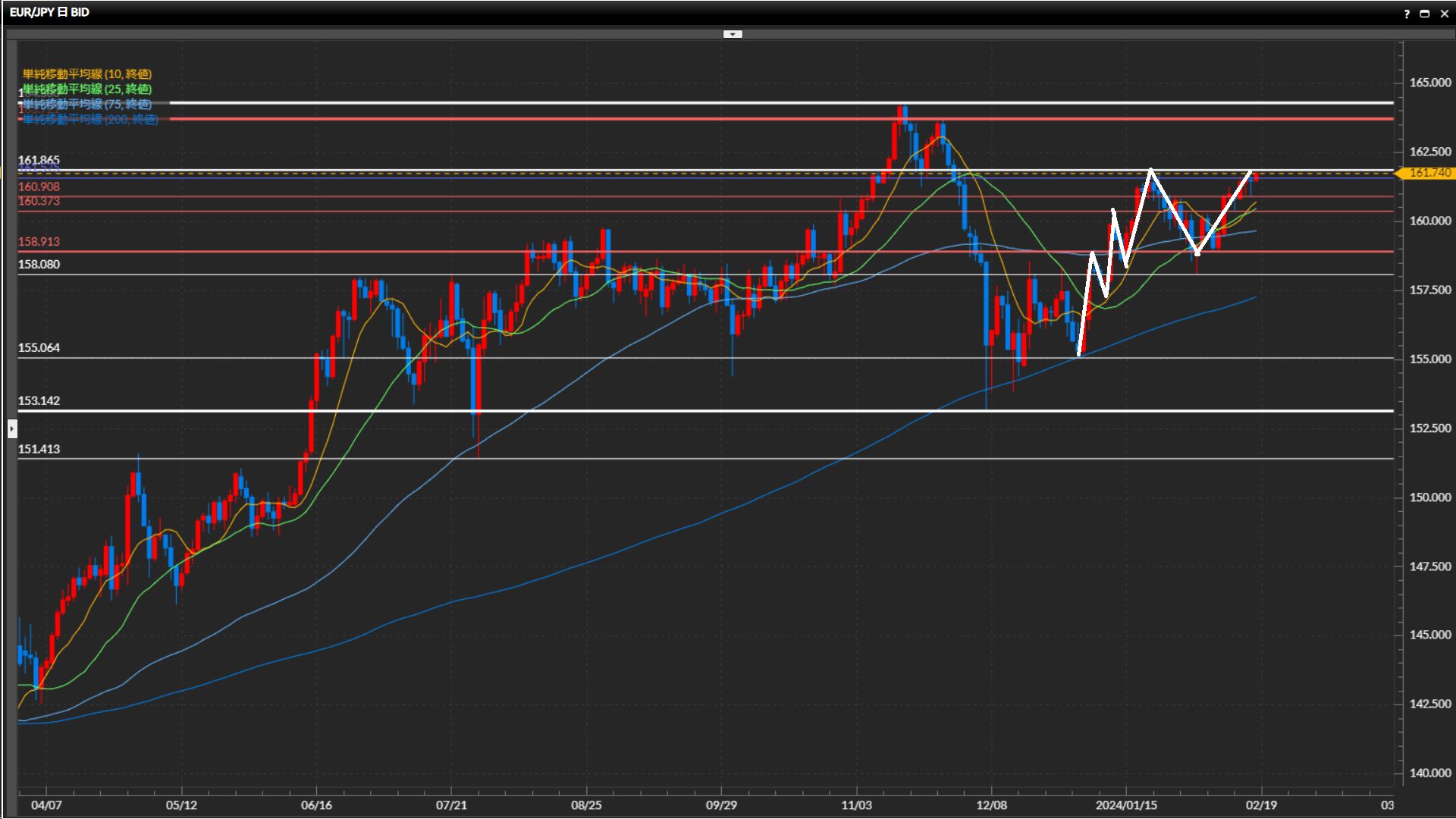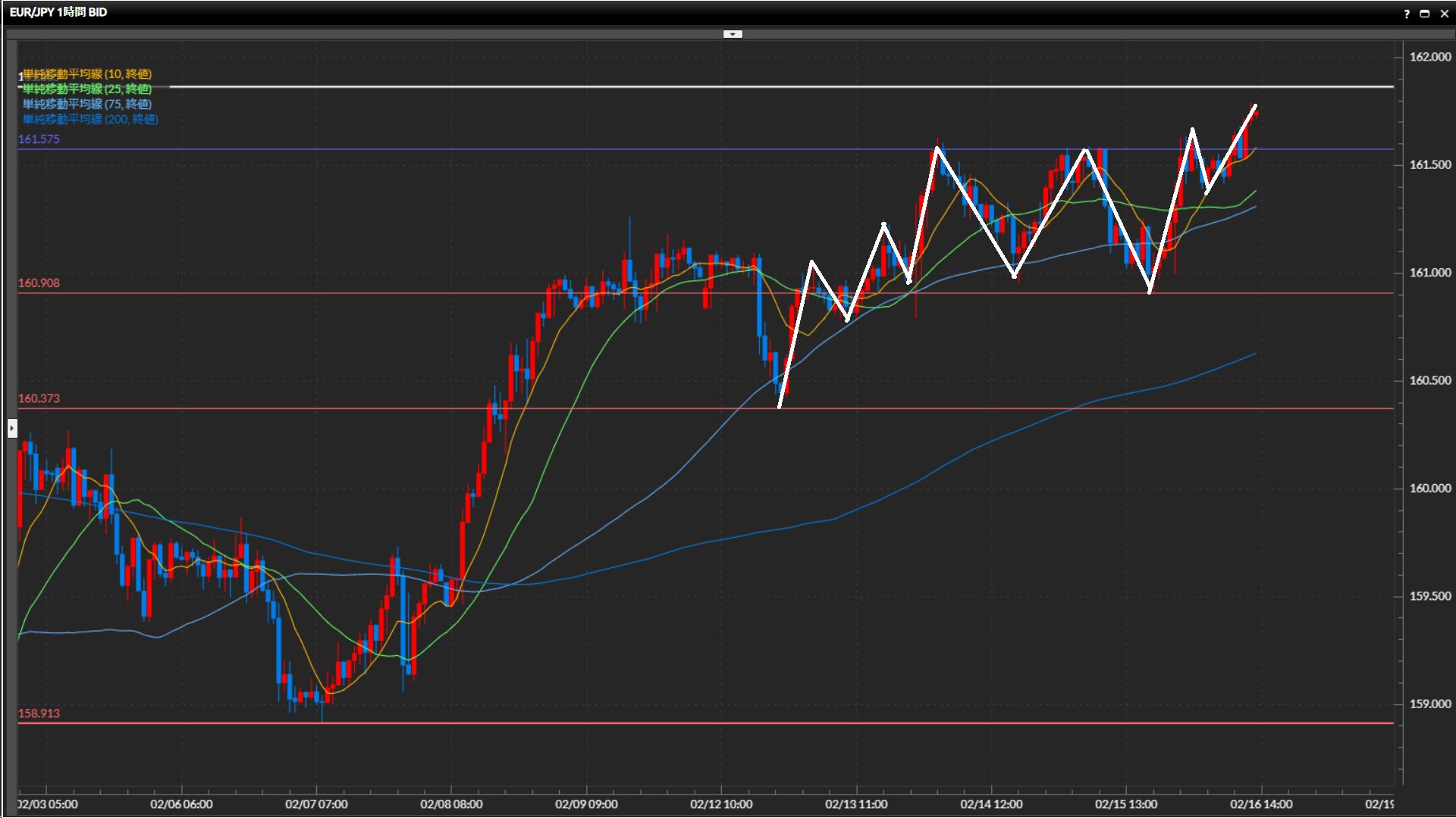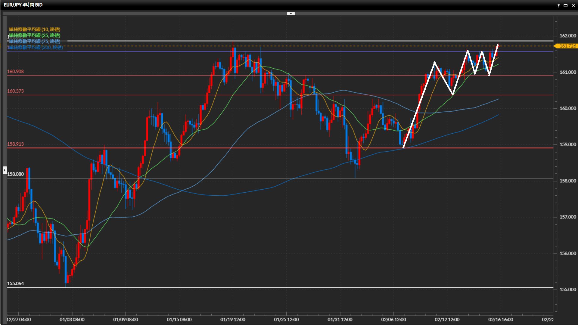 直近安値を158.08円。直近高値161.87円を切り上げられるかが焦点。