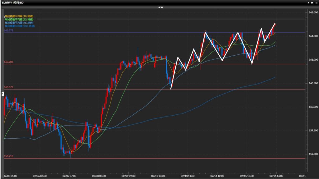 基本は押し目買い。1時間足が直近安値を切下げたら手仕舞い。 - ユーロ円は日足〜1時間足で上目線。