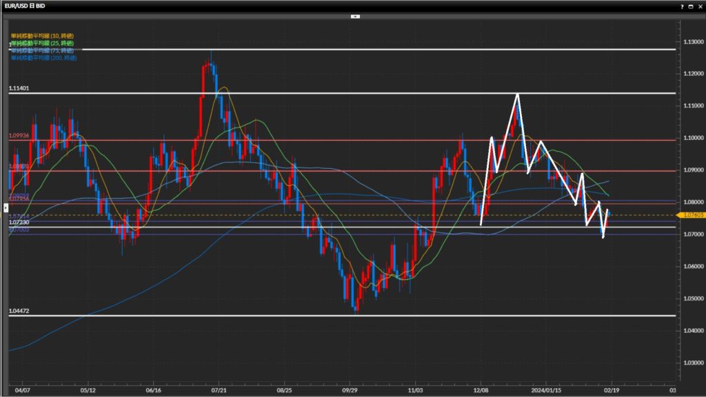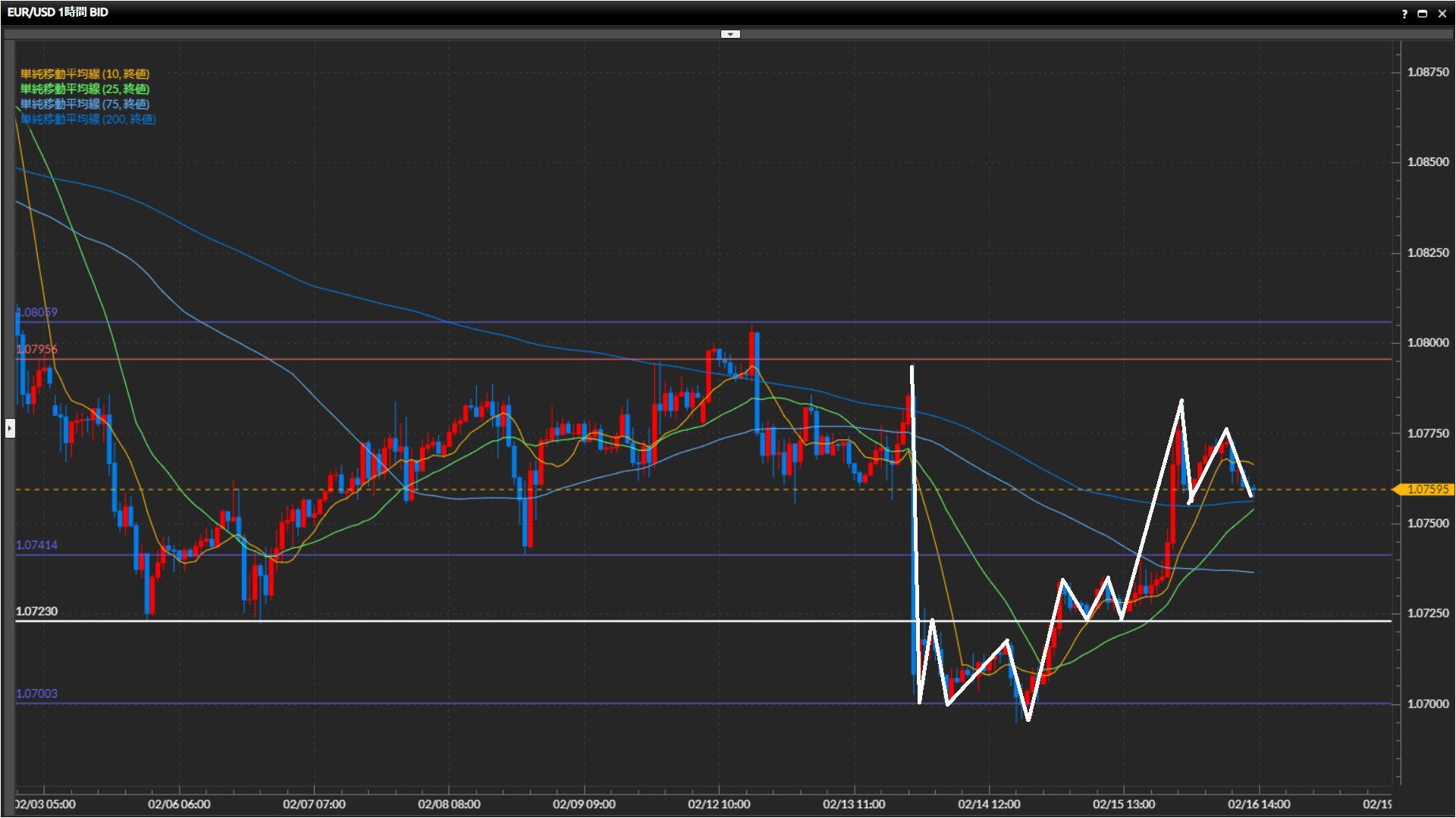日足水平線1.0723ドルを下抜け。ただし下抜け後の波で日足水平線の上側まで戻っている。