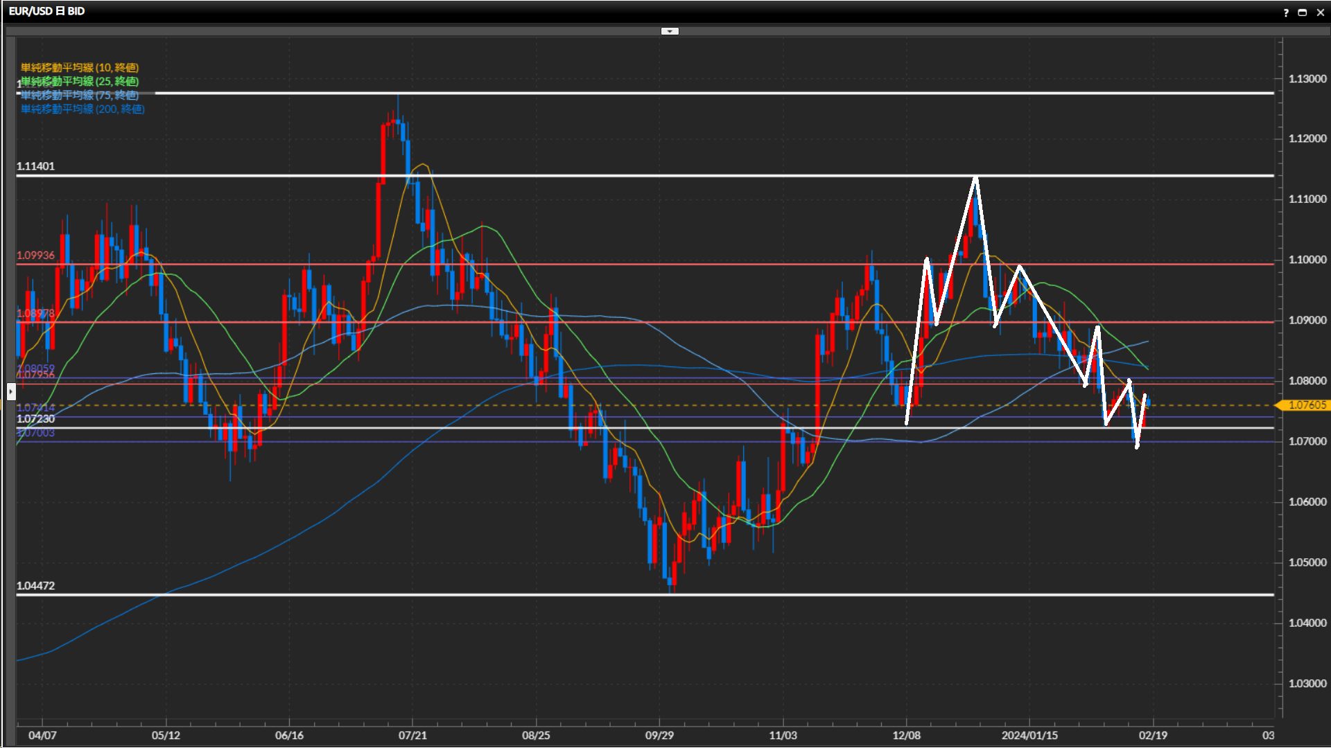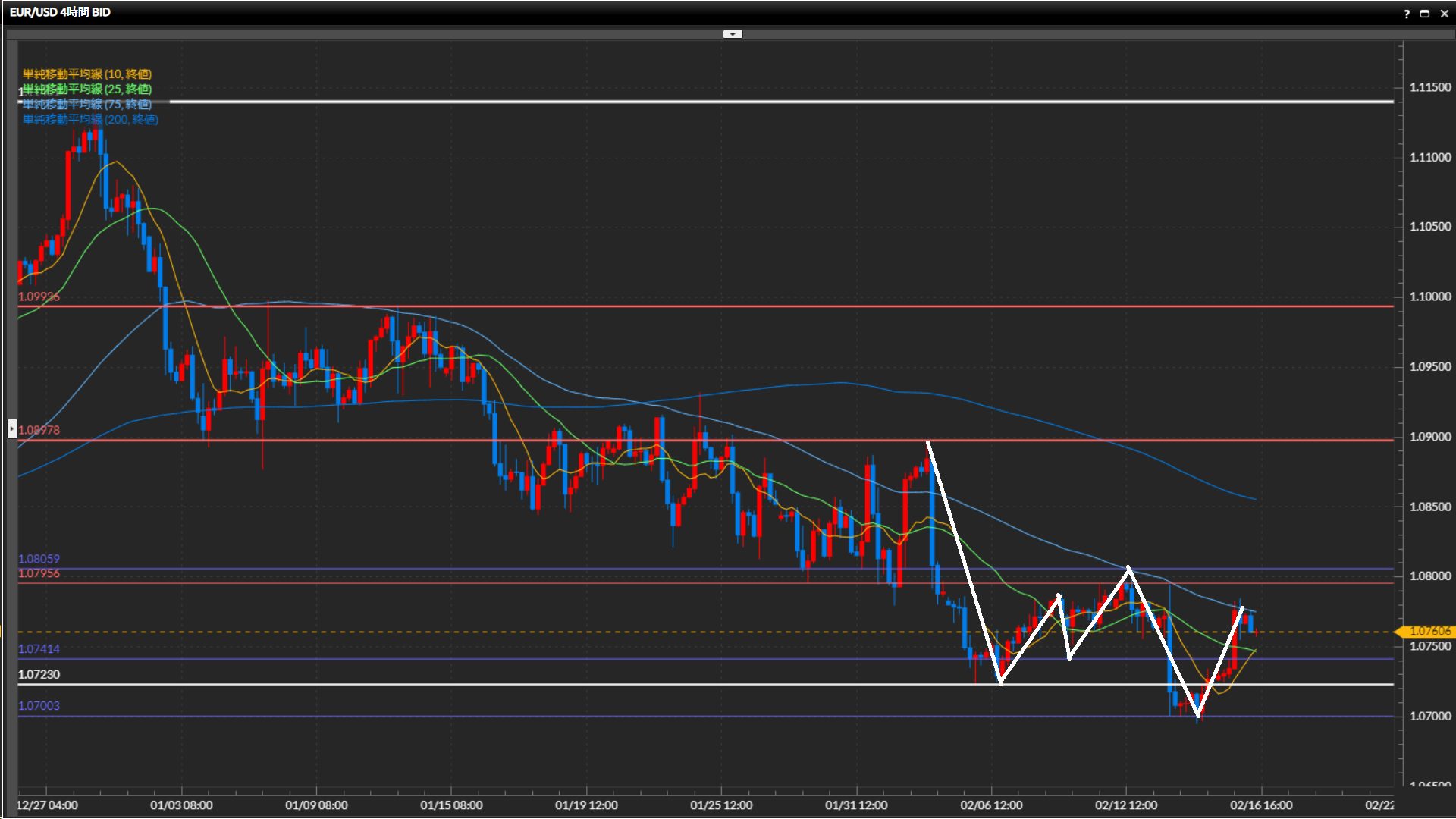 目線の定まらない相場が継続しており、基本は様子見。 - ユーロドルは日足は下目線、4時間足〜1時間足は上目線終了。