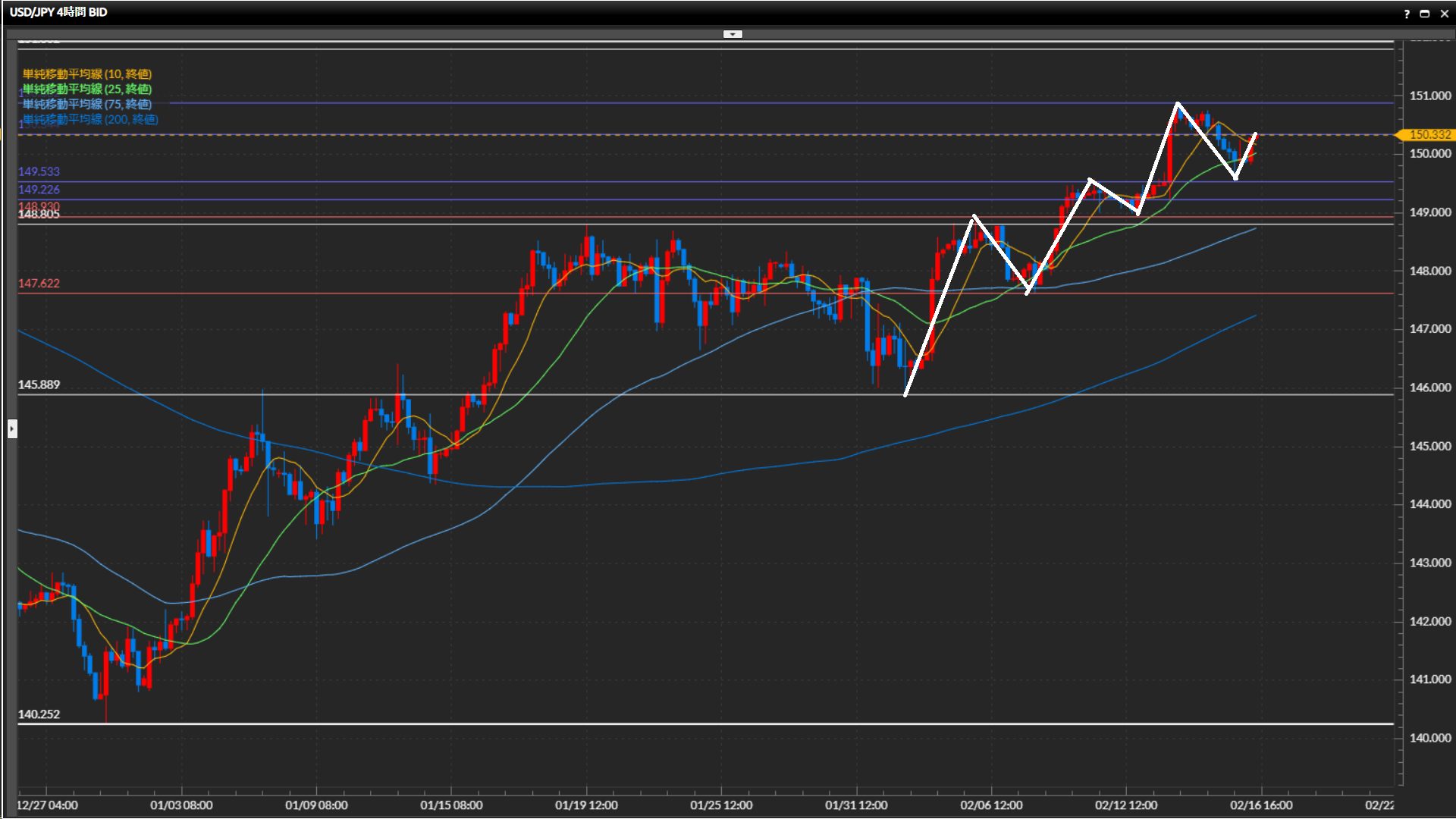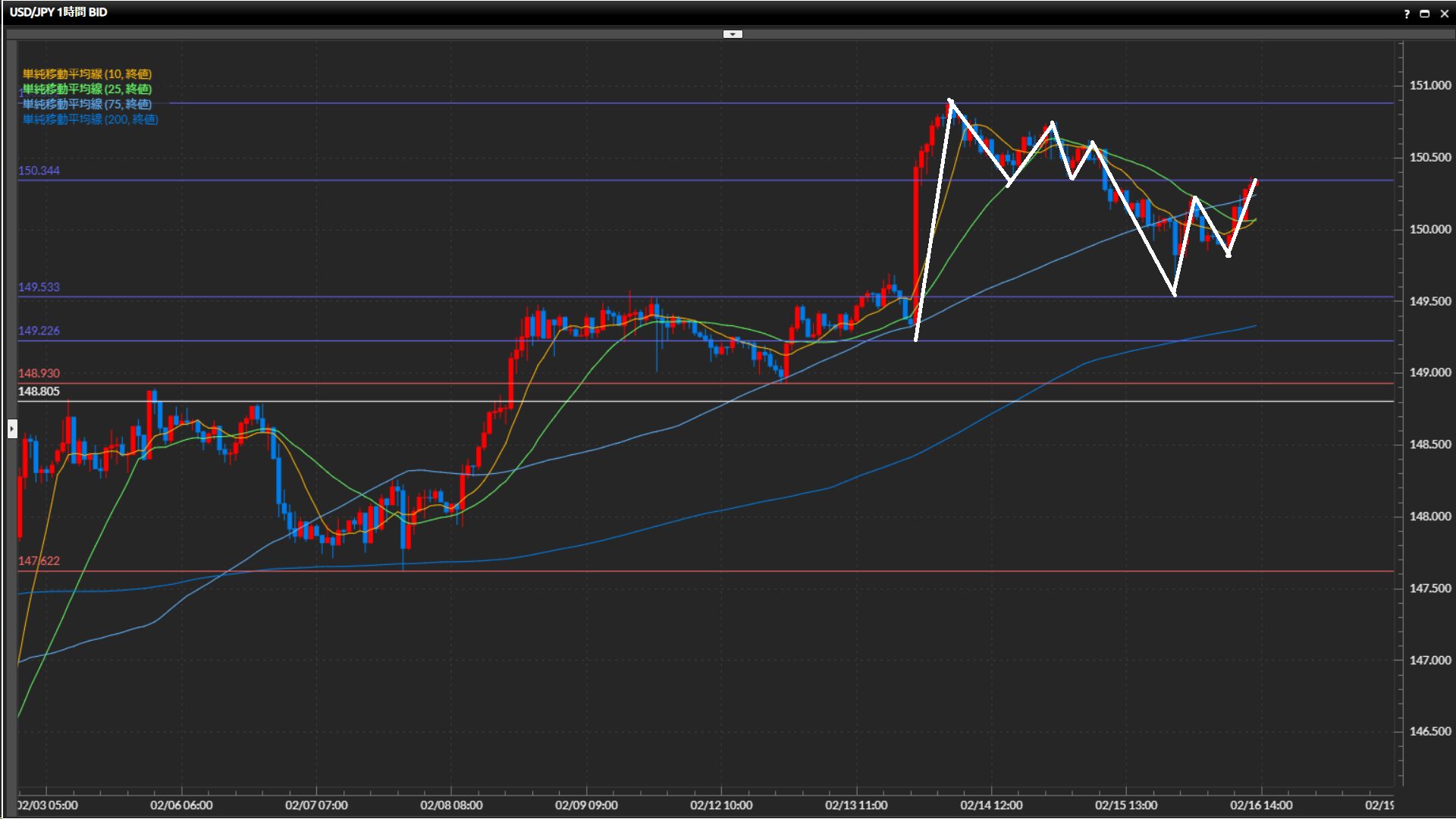 直近安値は149.81円。10SMAと25SMAがゴールデンクロス。