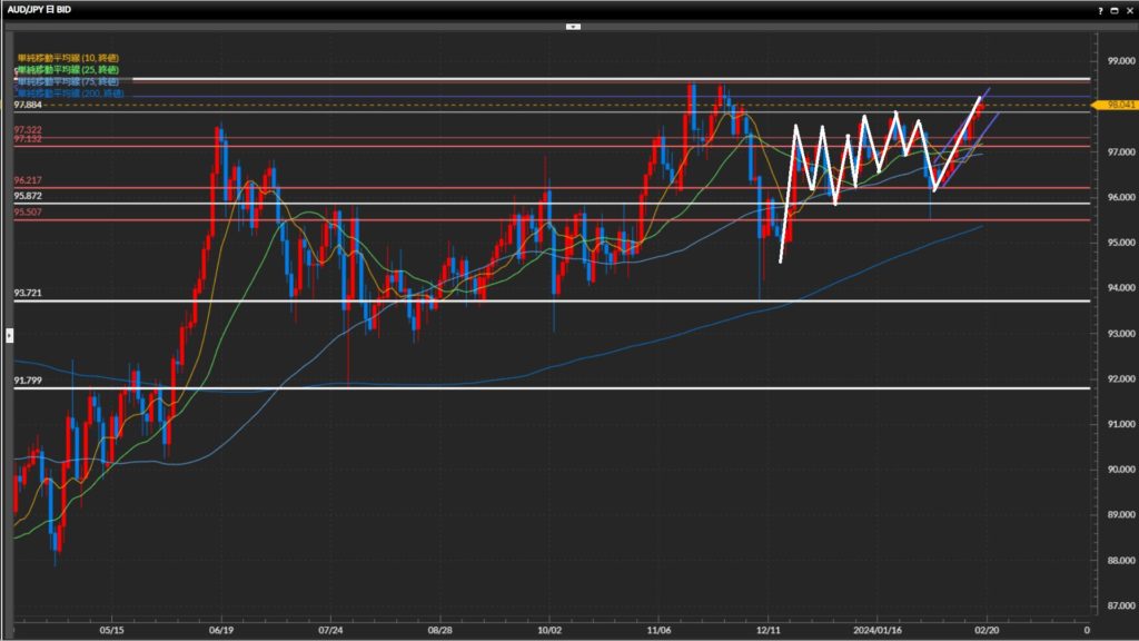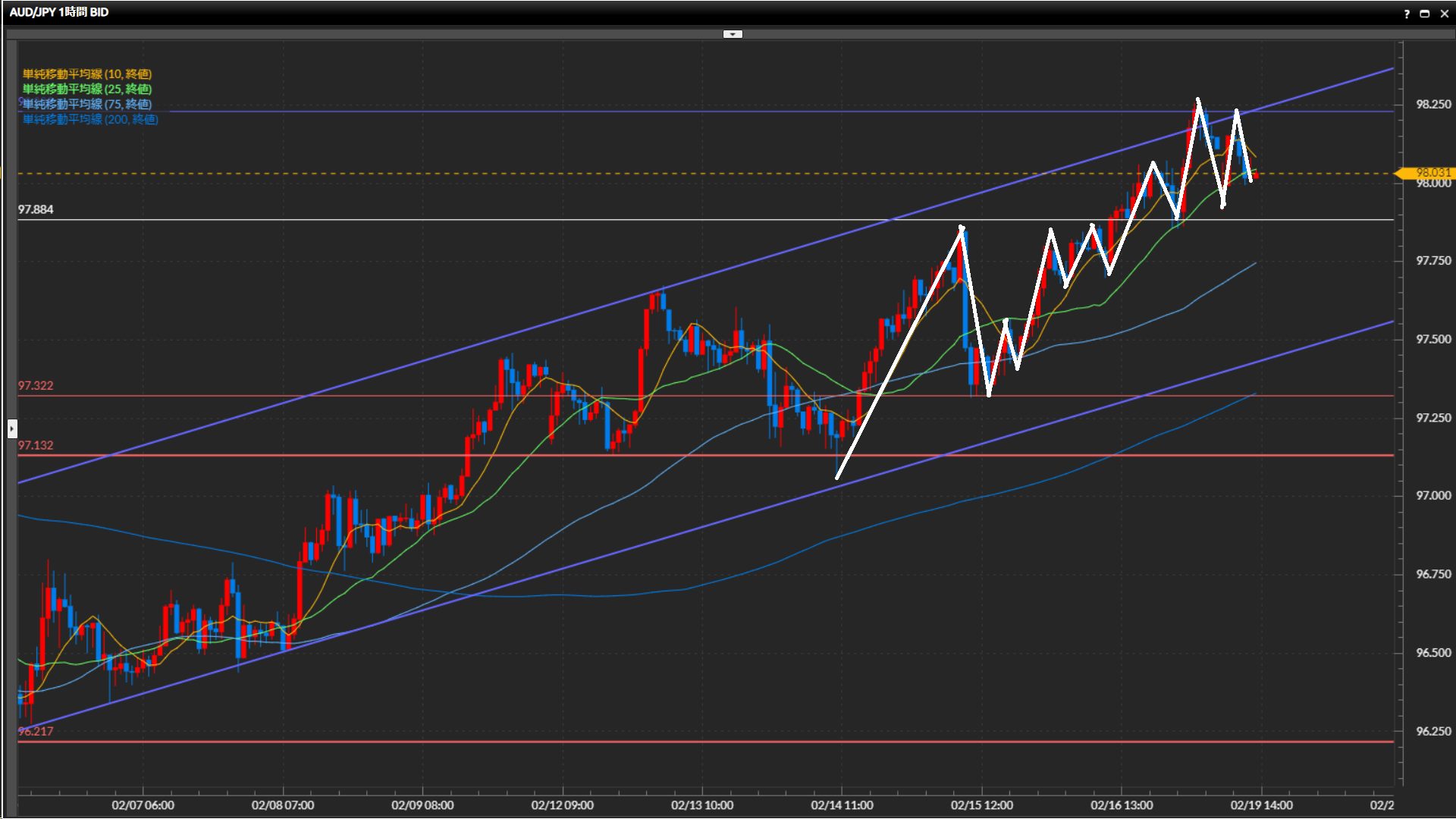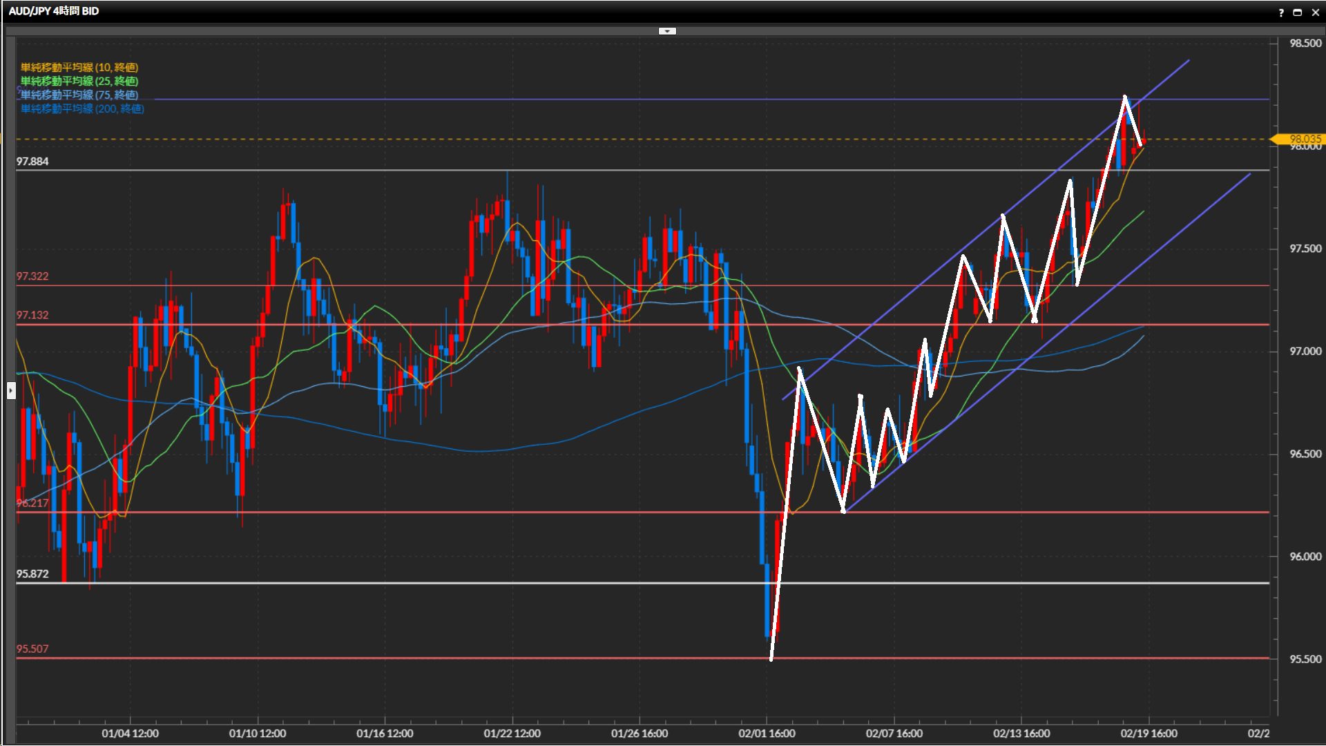 水平線97.88円の上抜け確定。直近の波で下目線になったにも関わらず高値を更新する辺りに、水平線の機能していなさが窺える。