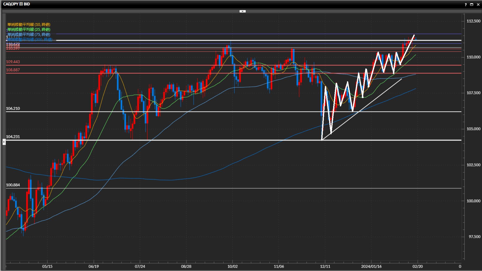直近安値は109.44円。日足最高値111.17円を上抜け確定。