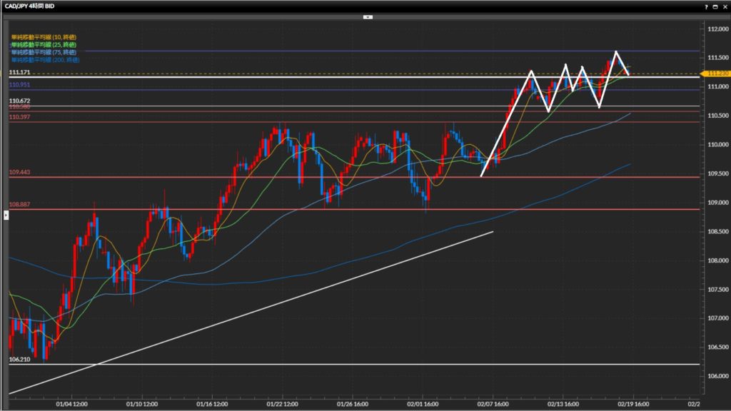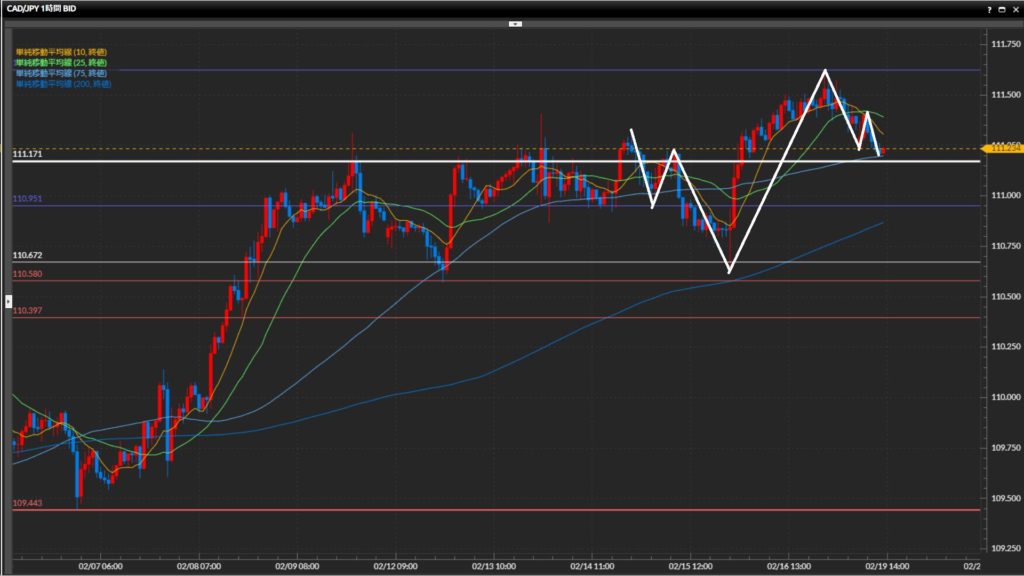 1時間足が再び上目線に転換したらロングを検討。 - 加ドル円は日足は上目線、4時間足はレンジ、1時間足は下目線。