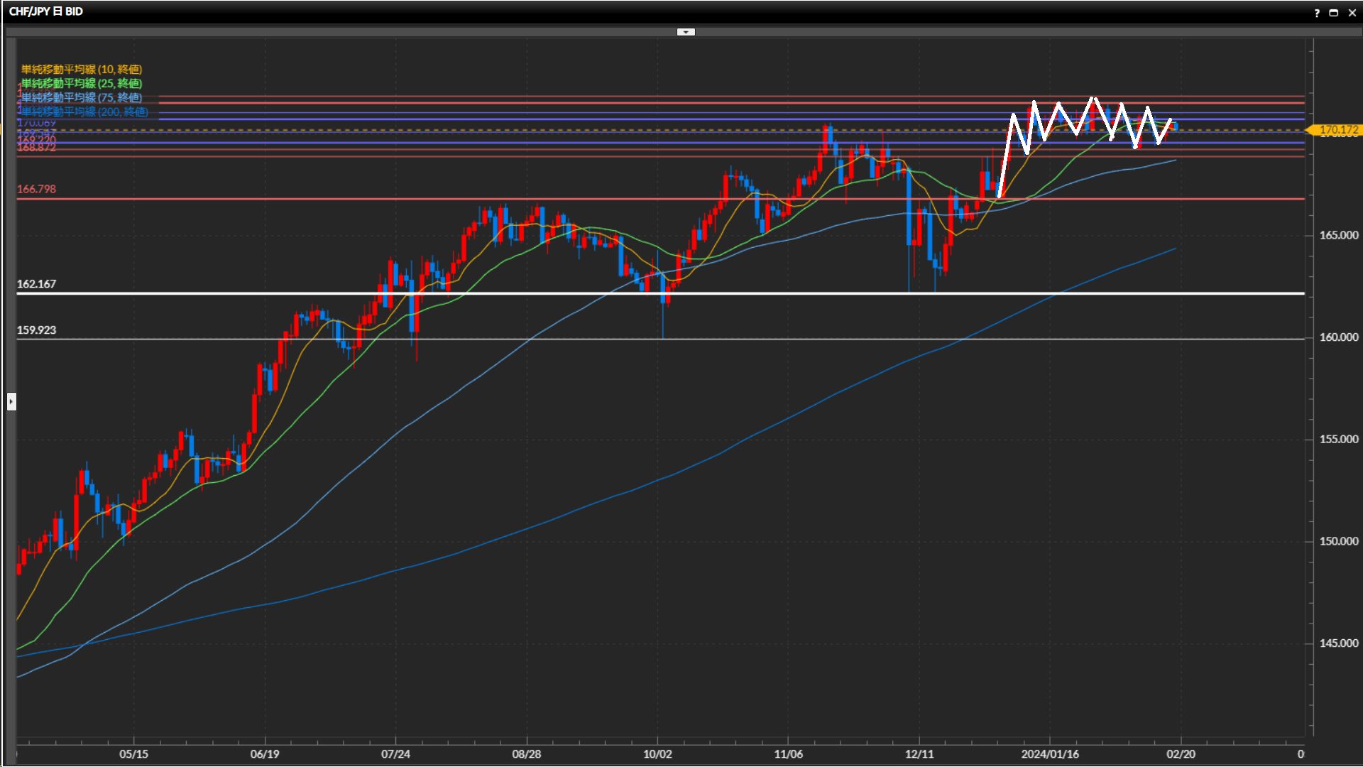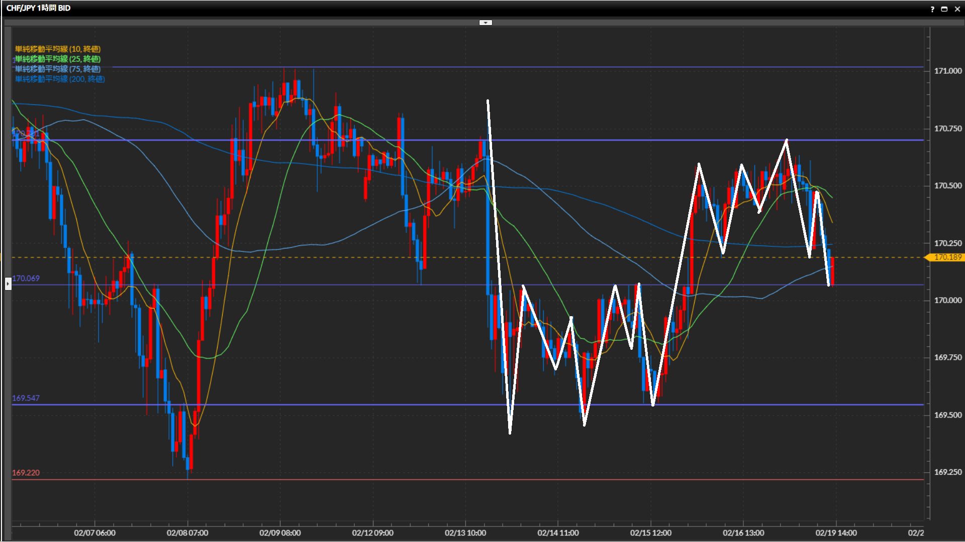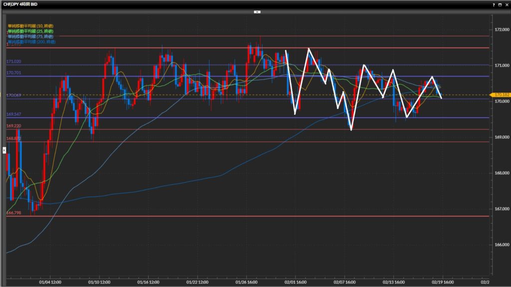 直近高値が170.61円の下目線。目線の定まらない動きが継続中。
