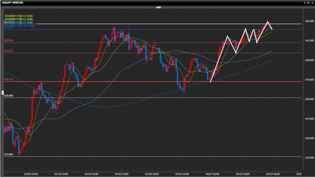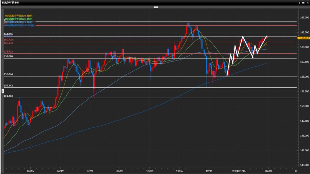直近安値を158.08円。先週末に直近高値161.87円をひげ足で上抜け。