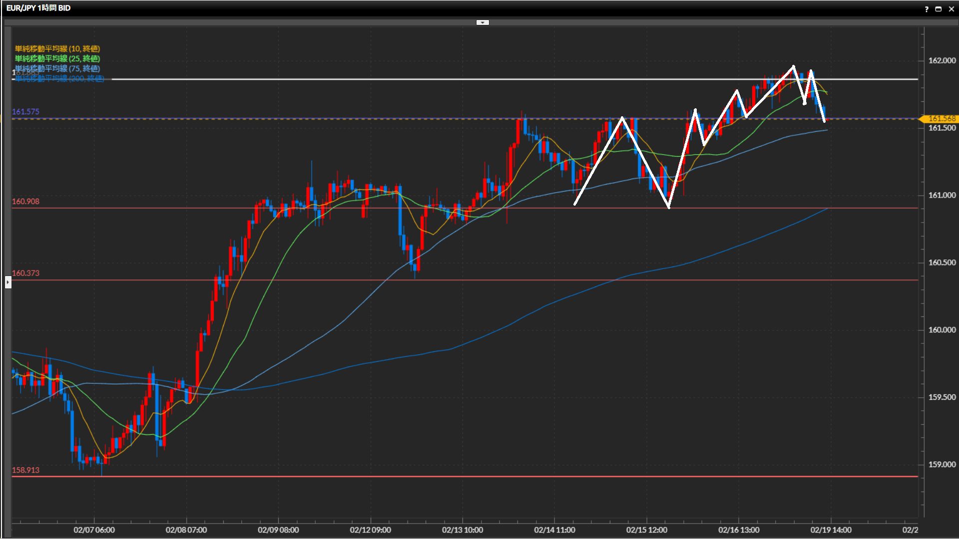 先週末夜中に日足水平線161.87円を抜けたが、週明け本日は下目線へ転換。