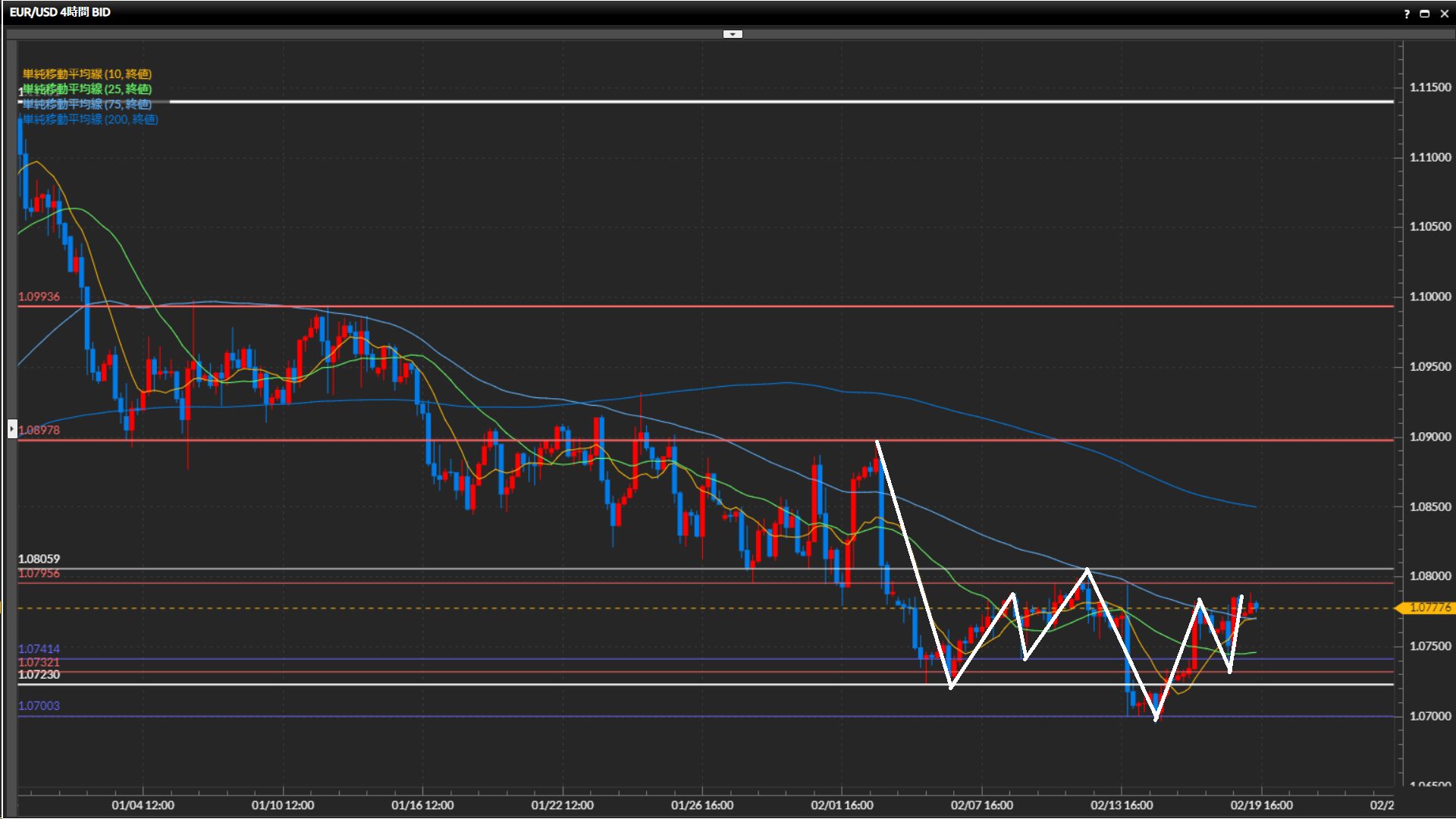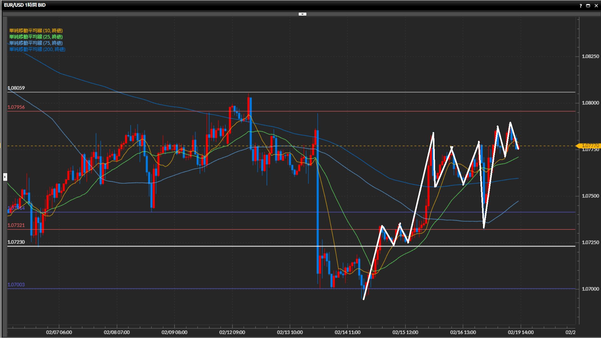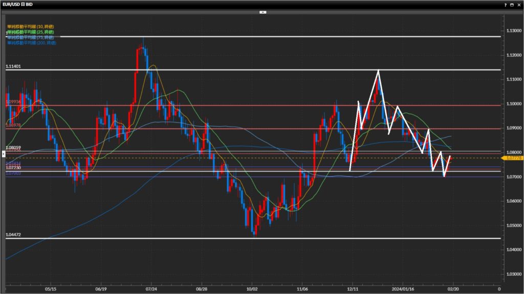 直近高値は1.0806ドル。日足水平線1.0723ドルを下抜け確定後の戻りが強い。