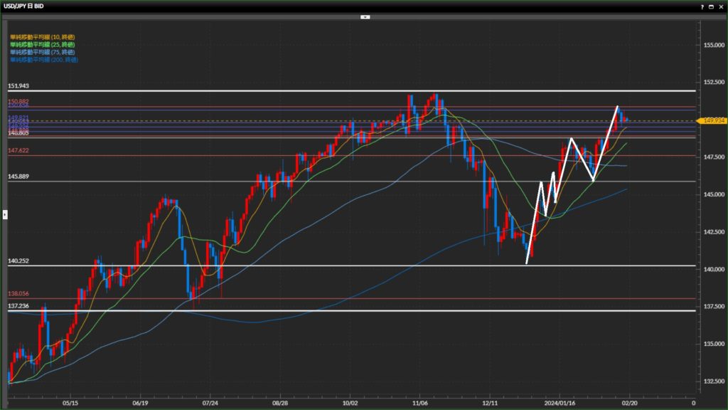 直近高値は150.29円。SMAはパーフェクトオーダー。