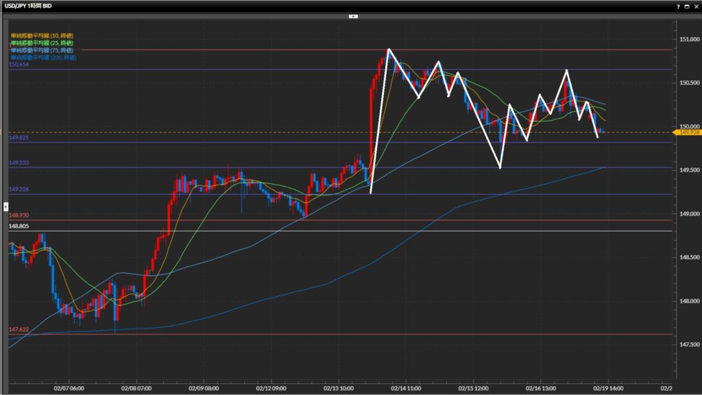 高値を150.66円で切下げ。テクニカル的にはショートを狙いたいが、ファンダ的な意識がまだまだ上を向いているため、様子見。