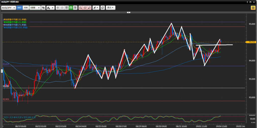 【1時間足】4時間足同様に上昇トレンド。94.32円付近からロングで仕掛けられたら最高。