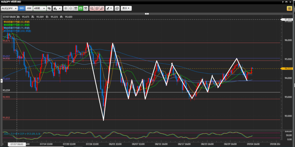 【日足】特徴として波が細かく、かつ形が明瞭のため分析しやすい。大きな流れでは下降トレンドだが直近の波は安値を更新できず、高値をひげ足で上抜けている。95.00円台に乗ったら上目線に転換。