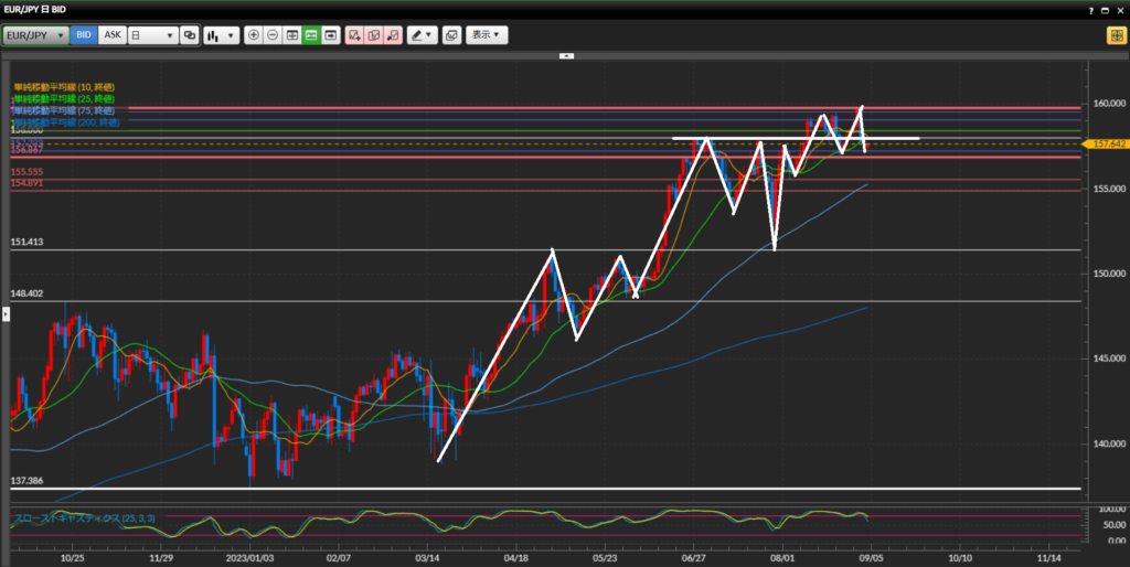 【日足】大きな流れは上昇トレンドだが、30日に最高値159.76円を付けた後は大幅下落。翌日31日は日足水平線や25SMAを割り込む水準でローソク足が確定。160円台が強く意識されている事が伺える。