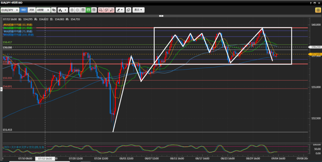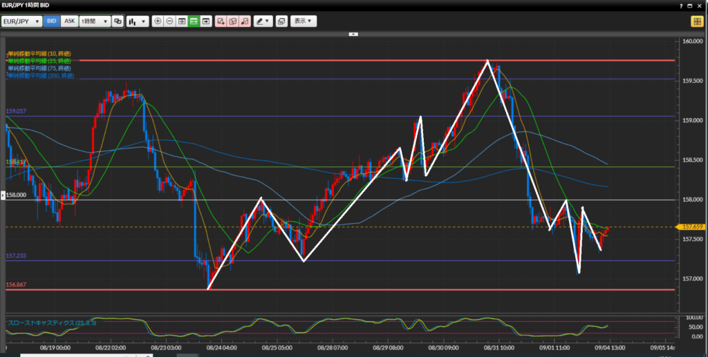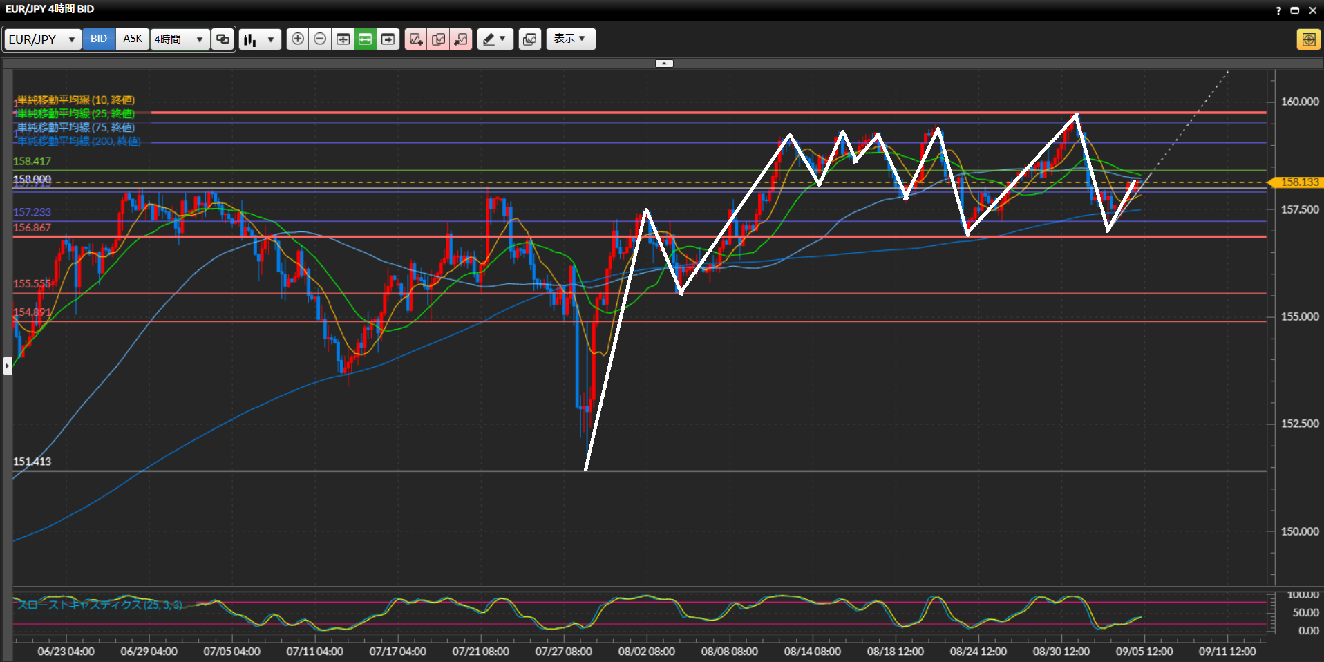 【4時間足】直前の波で高値安値をどちらも更新しているため方向感が不明瞭。4時間足水平線156.87-159.76円の間でレンジになっていると見て、現在は安値付近に到着した所。