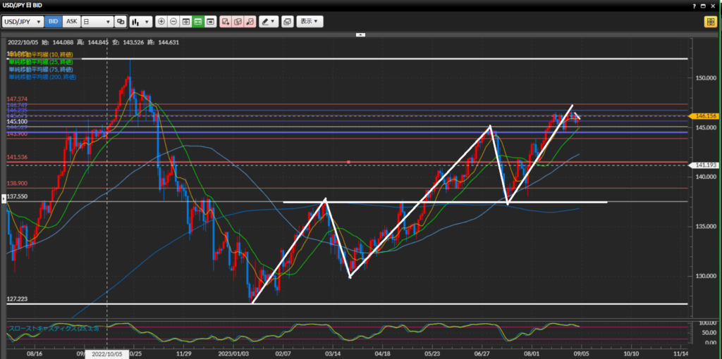 【日足】綺麗に高値安値の切り上げの形になっており上目線。しかし足元の動きは147.37円を最高値に停滞中。