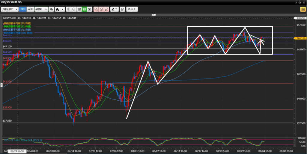 【4時間足】8月中旬以降レンジ状態。最高値は147.37円、最安値は144.53円。13時時点では最安値の水平線で反発したのち上昇中、中間付近を超えたところ。