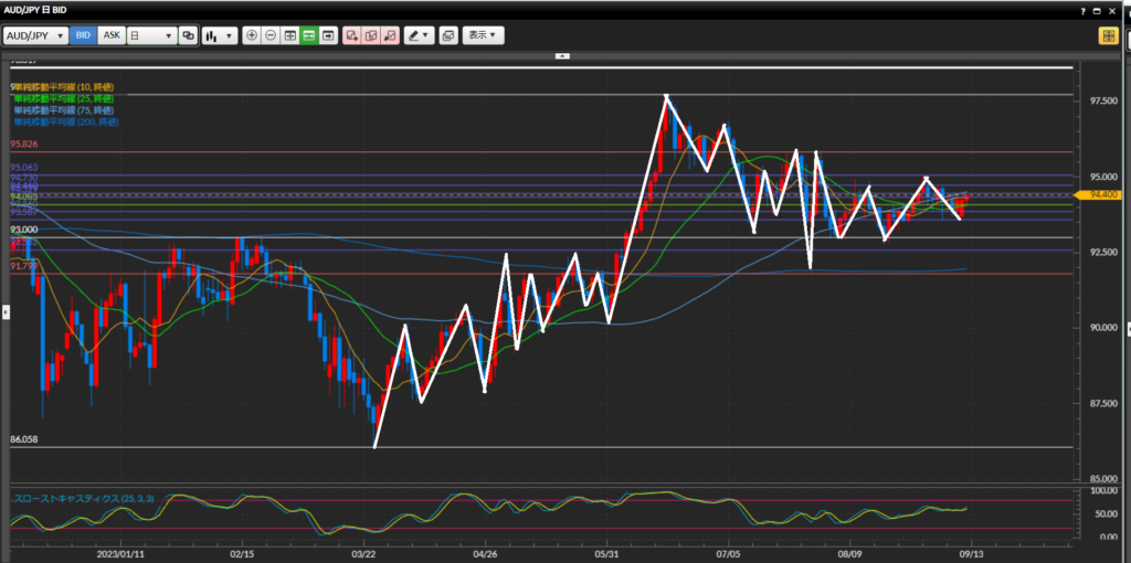 【日足】大きな流れでは下降トレンドだが直近の波は安値を更新できず、高値をひげ足で上抜けている。95.00円台に乗ったら上目線に転換。