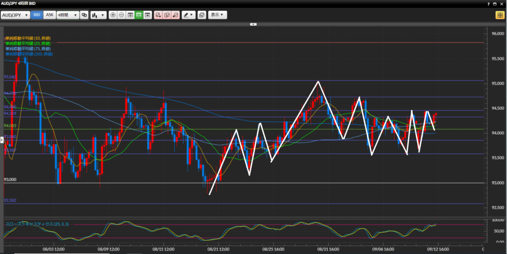 【4時間足】ドル円、ユーロ円と異なり週明けの下落後は窓を埋める動き。先週末高値94.45円の手前で停滞している。今の波が上抜け失敗すればトリプルトップ。