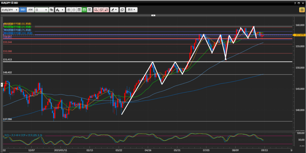 【日足】大きな流れは上昇トレンドだが、160円台が強く意識されており30日に最高値159.76円を付けた後は大幅下落。翌日31日は日足水平線や25SMAを割り込む水準でローソク足が確定。直近はSMAがあまり機能してない様子。
