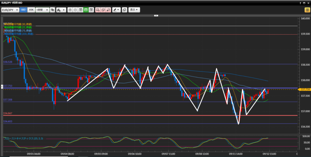【1時間足】4時間足とは打って変わりSMAはゴールデンクロスしており上向き、あまり方向感の根拠にはできなさそう。本日10時台に窓の高値157.750円をヒゲ足で突破、そのあとは一旦反発している。