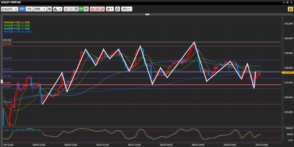【4時間足】昨日重要な水平線156.87円を実線で下抜け確定したものの、結局は156.87-159.76円のレンジへ戻っており、下値の堅さを意識させる動き、とはいえ上昇の意思も感じたれず、現状SMAは下向きだが機能している様子はない。
