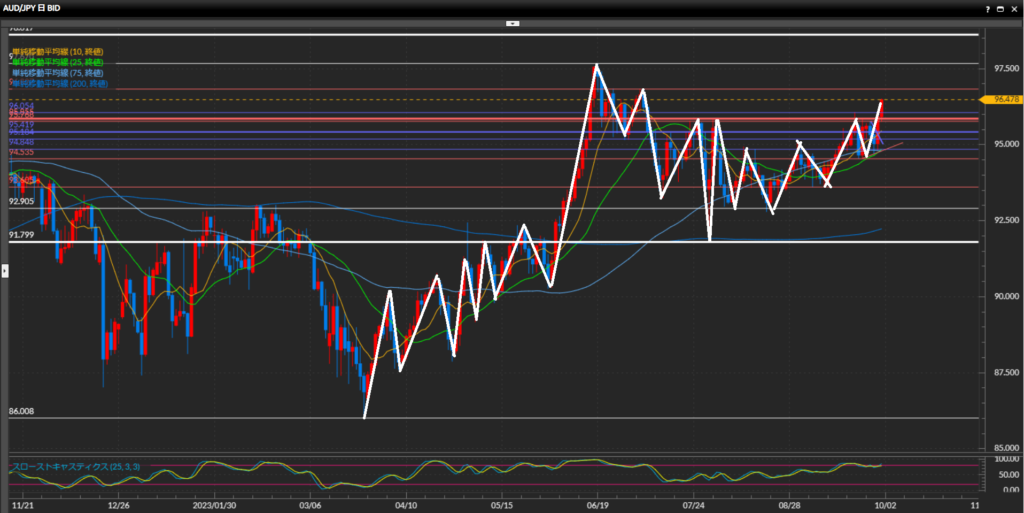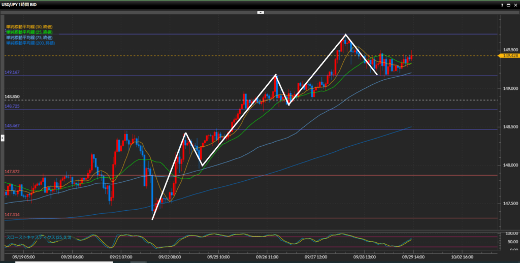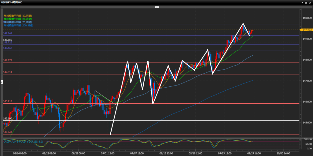 綺麗に高値安値の切り上げの形になっており上目線。9月20日以降上昇の勢いを強めており、148円台をあっさり通過し149円台後半へ突入。直近3日間連続で高値更新中。