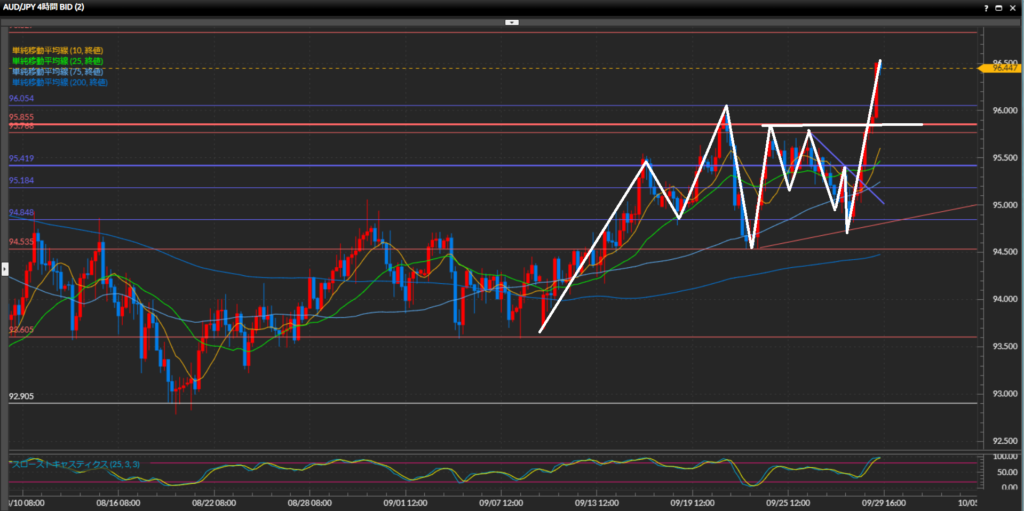 • AUDJPYは日足、4時間足、1時間足すべて上目線のため、一旦下落するのを待って押し目買い狙いのスタンス。次に上値として意識されそうなのは4時間足水平線96.83円付近。