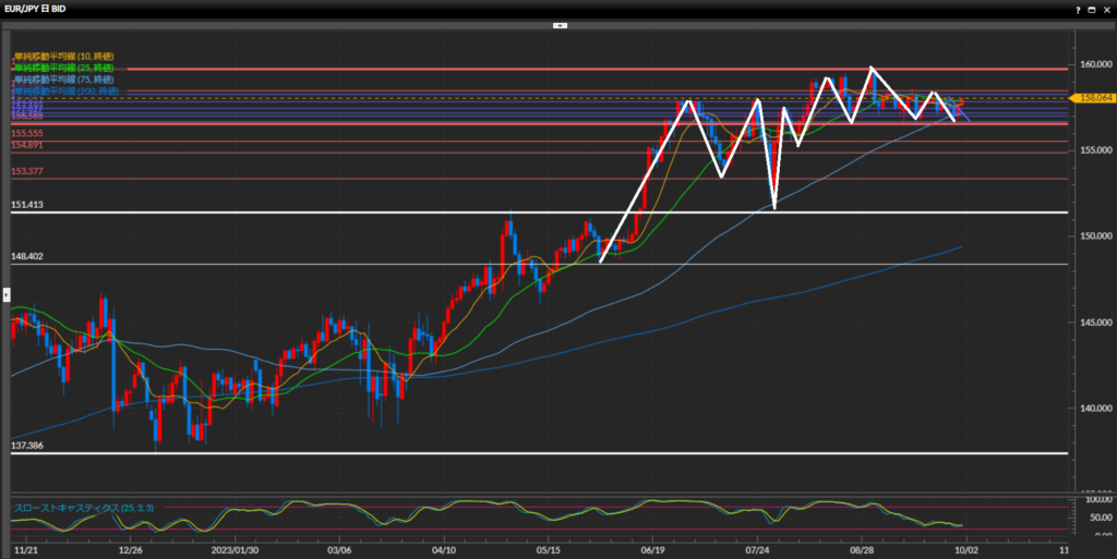 大きな流れは上目線だが、160円台が強く意識されており、8月30日に最高値159.76円を付けた後は下落し、小さな波は狭いレンジで停滞中。昨日75SMA付近で反発上昇。