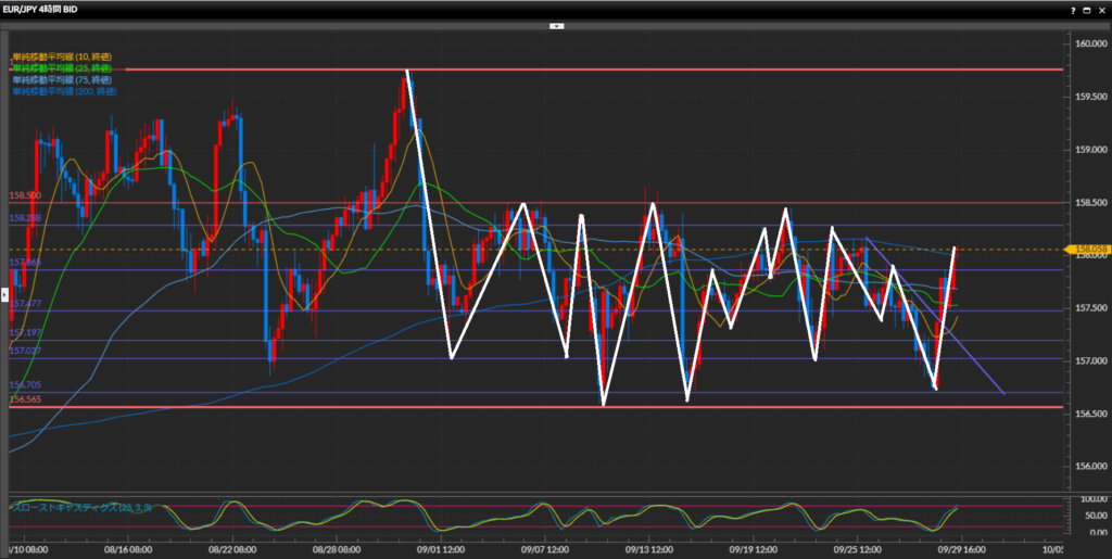 大きな流れでは156.57円-159.76円のレンジになっており、その中に156.57円-158.50円の小さいレンジを形成しているという構造。部分的に高値安値更新のトレンドになっている小さな波もあるが、それ以上にレンジの意識が強くトレンドが継続していない。