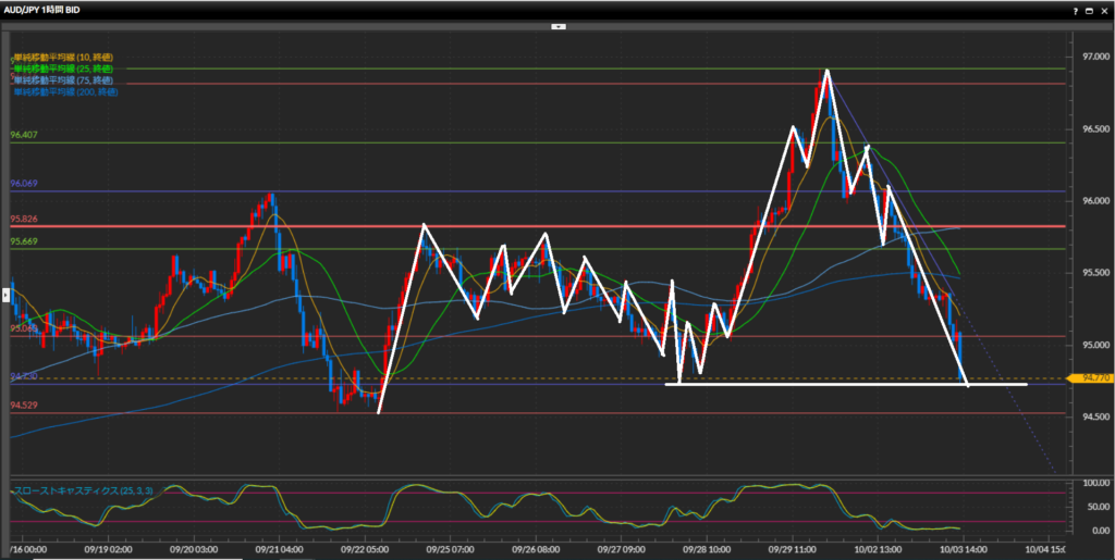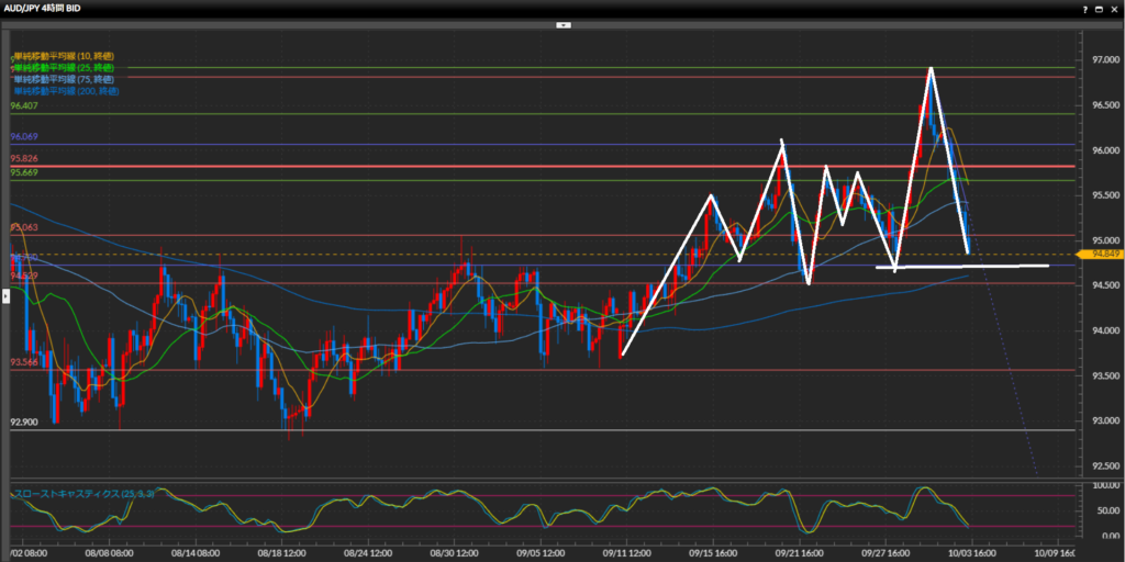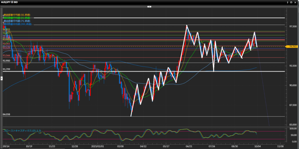 執筆時点で直近の安値94.73円をひげ足で下抜け。実体で確定したら下目線に切り替え、戻り売りスタンス。