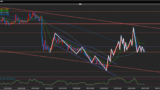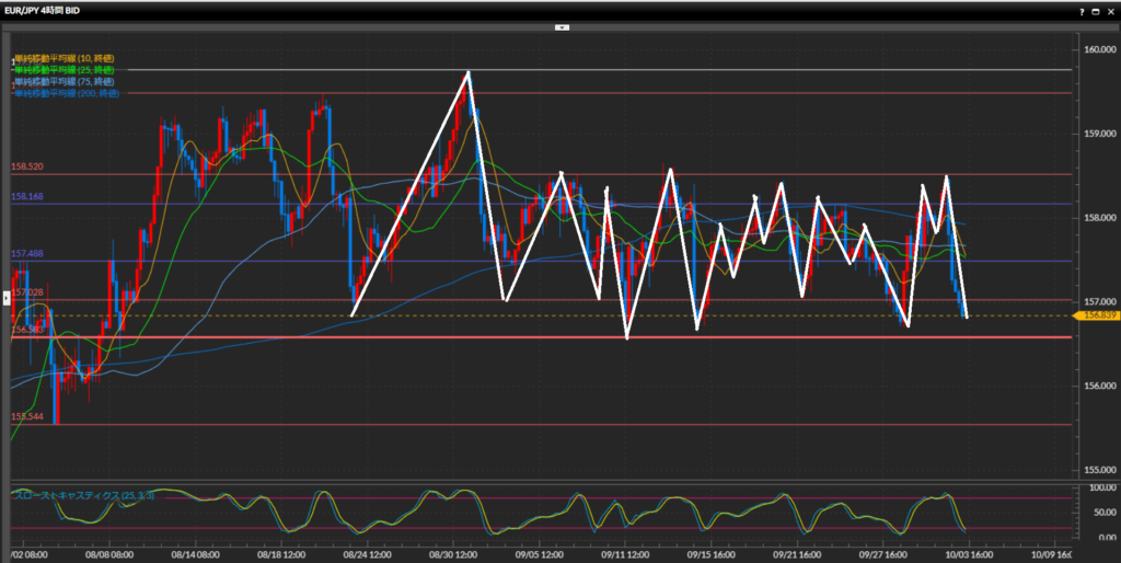大きな流れでは156.58円-159.76円のレンジになっており、その中に156.58円-158.50円の小さいレンジを形成しているという構造。部分的に高値安値更新のトレンドになっている小さな波もあるが、それ以上にレンジの意識が強くトレンドが継続していない。