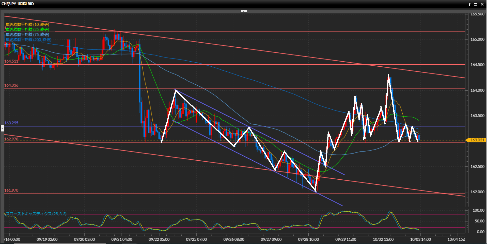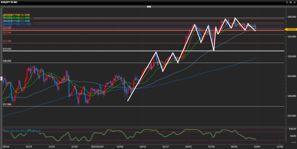 大きな流れは上目線だが、160円台が強く意識されており、8月30日に最高値159.76円を付けた後は下落し、小さな波は狭いレンジで停滞中。昨日75SMAを下抜け確定。