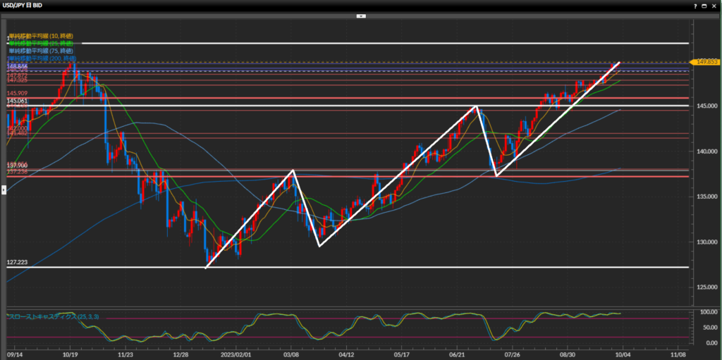 綺麗に高値安値の切り上げの形になっており上目線。9月20日以降上昇の勢いを強めており、148円台をあっさり通過し149円台後半へ突入。