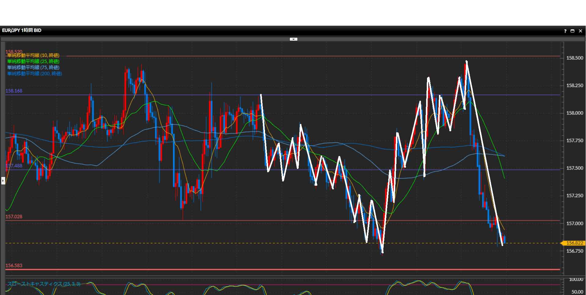 大きな流れでは156.58円-159.76円のレンジになっており、その中に156.58円-158.50円の小さいレンジを形成しているという構造。部分的に高値安値更新のトレンドになっている小さな波もあるが、それ以上にレンジの意識が強くトレンドが継続していない。