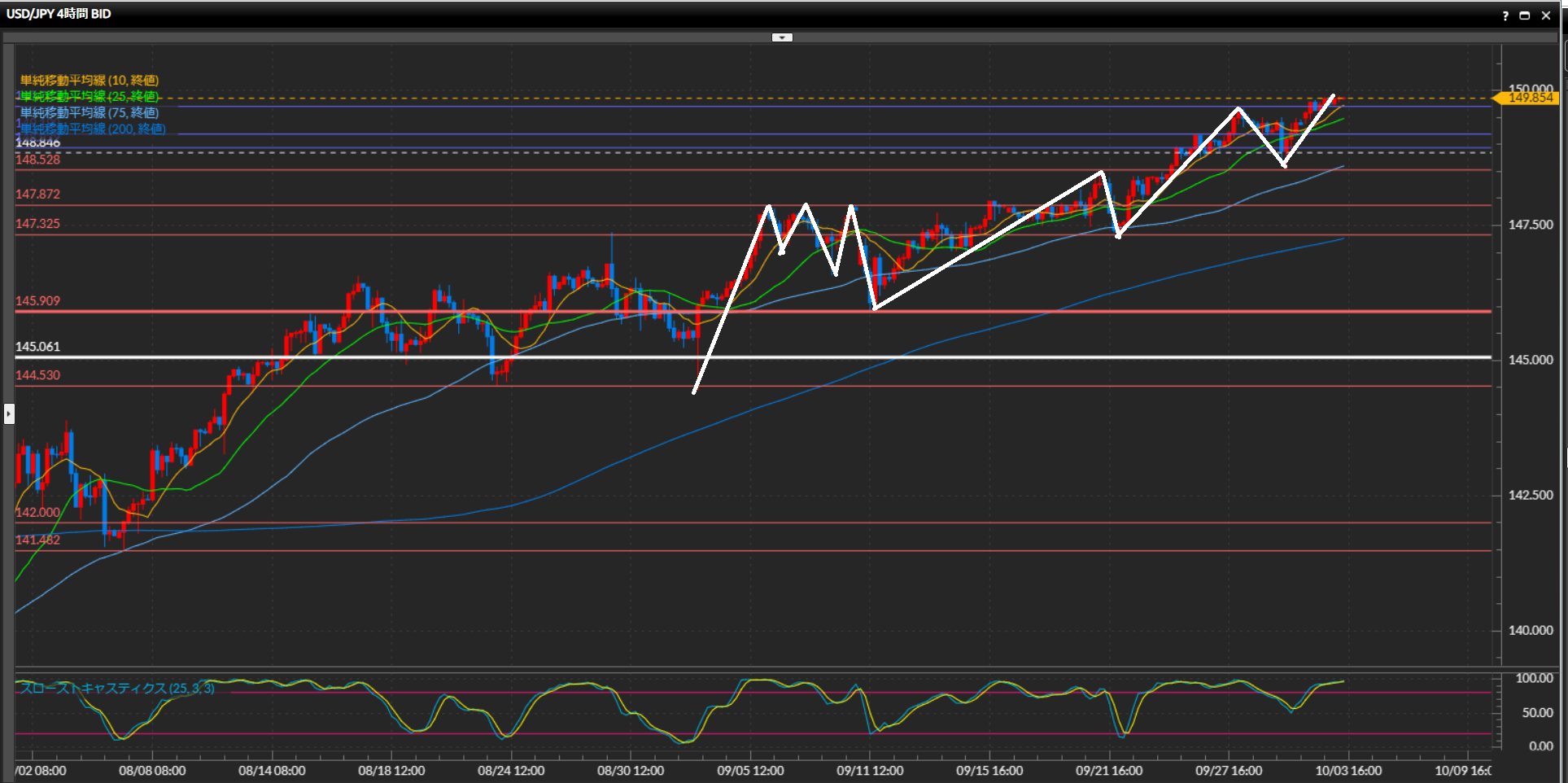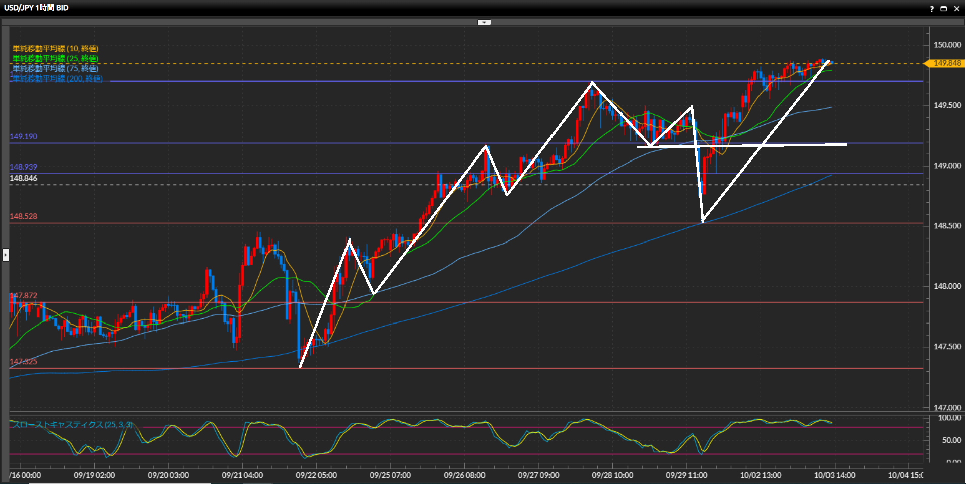 綺麗に高値安値の切り上げの形になっており上目線。9月20日以降上昇の勢いを強めており、148円台をあっさり通過し149円台後半へ突入。
