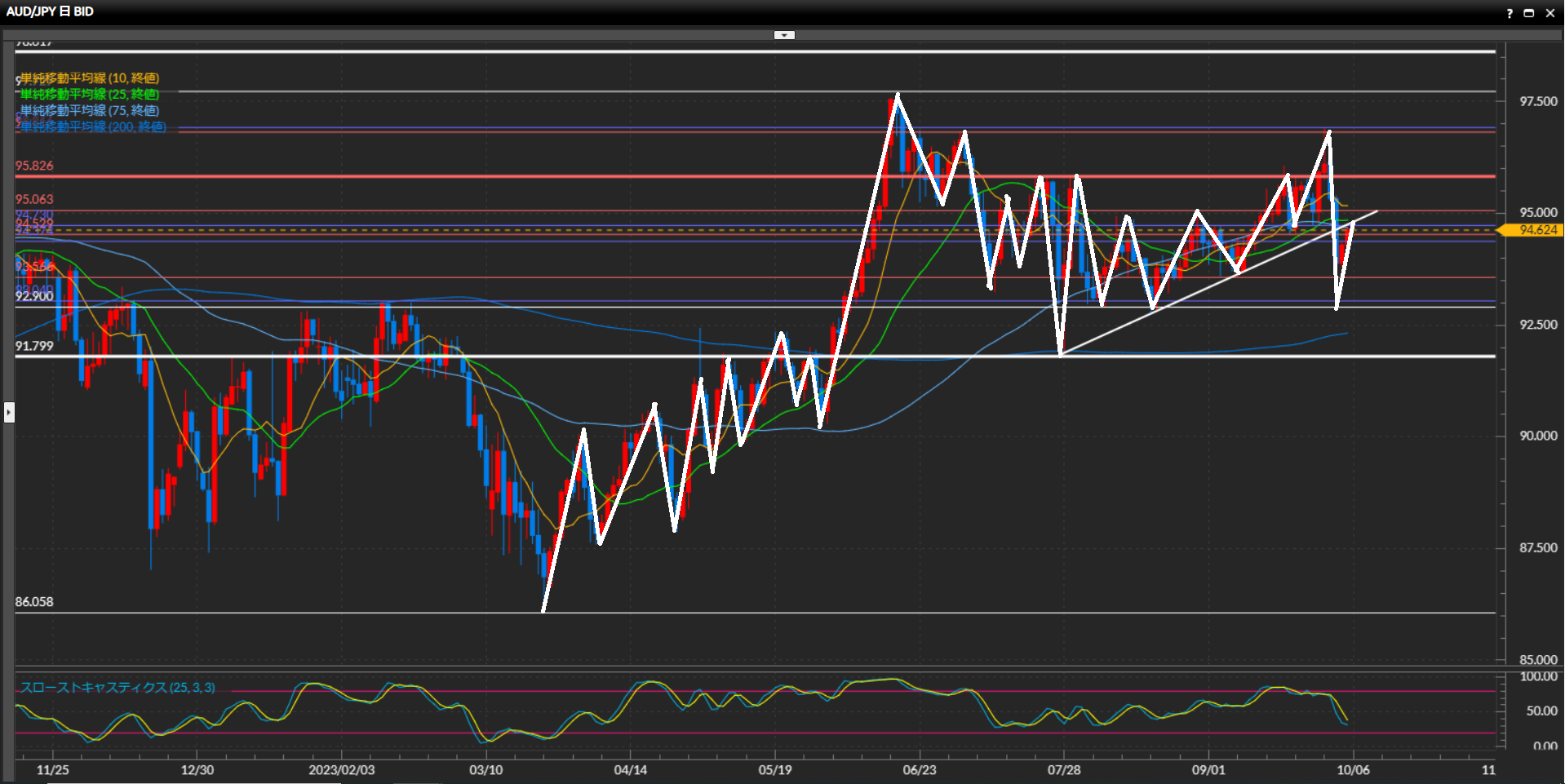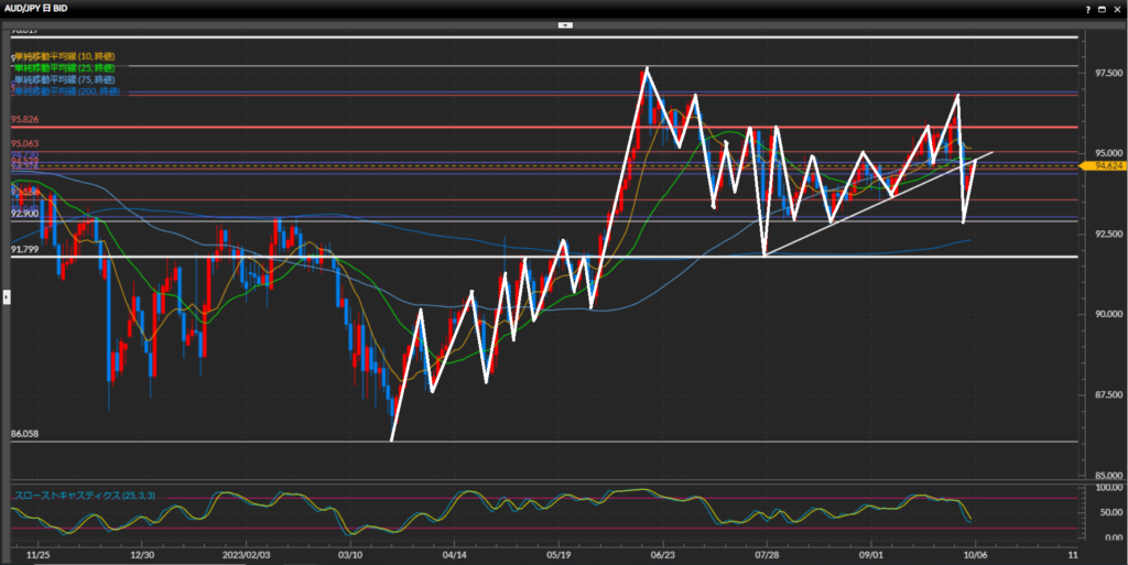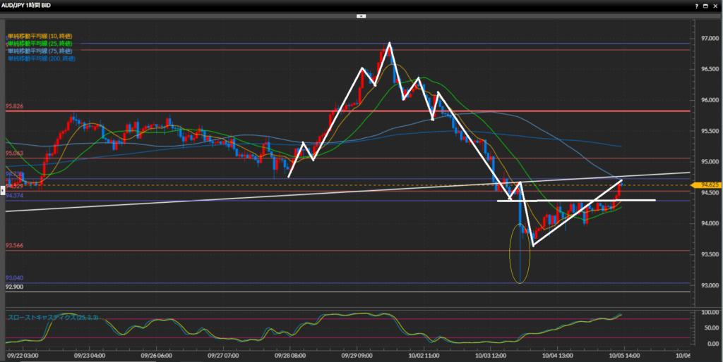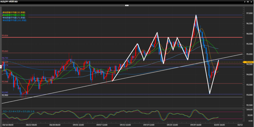 - AUD/JPYは4時間足、1時間足で下目線。日足で引いたトレンドラインや水平線94.73円付近で戻り目を作るか注目しつつ、レジスタンスされたらショートで狙う。