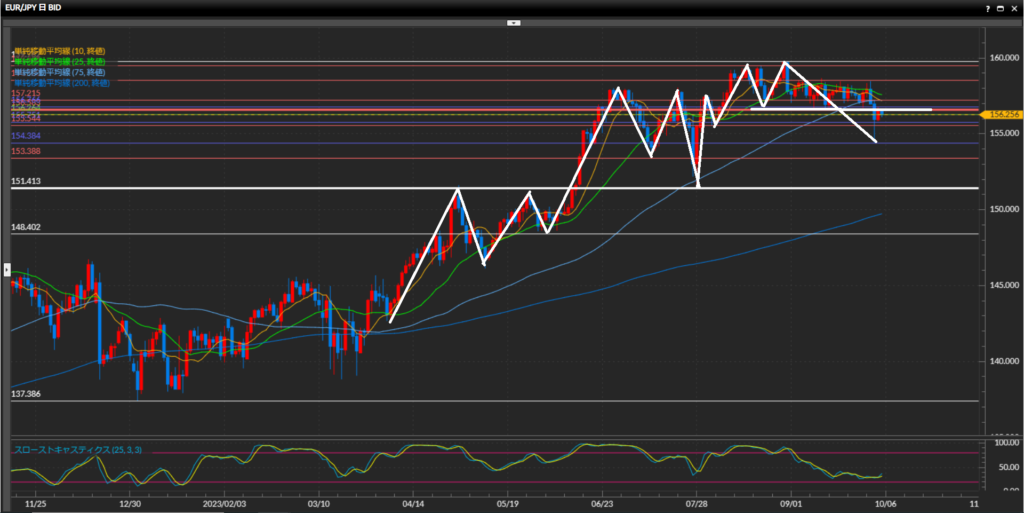 大きな流れでは日足水平線151.41円を抜けない限り上目線だが、4時間足水平線156.58円を下抜け確定した事から、下値を試す動きになる可能性が高い。