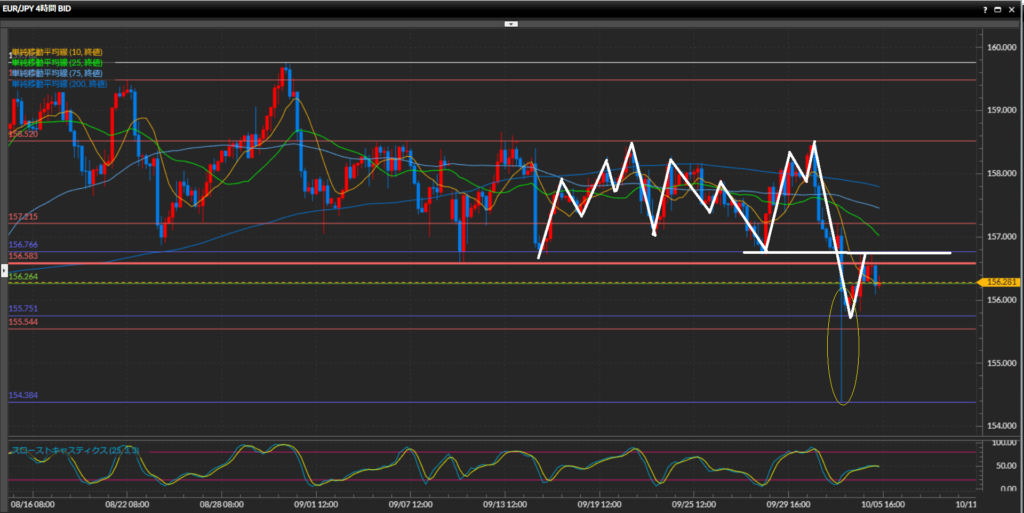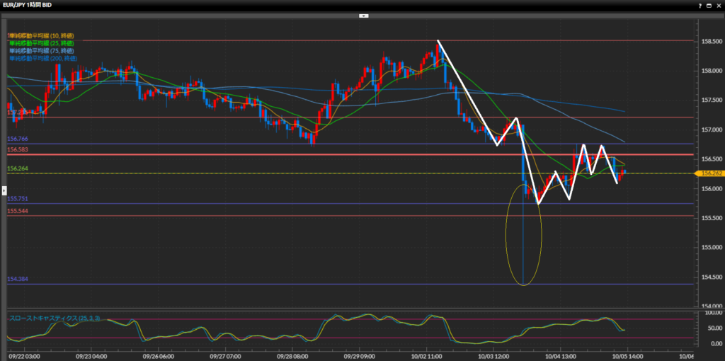 4時間足同様下目線。目線を分ける水平線156.58円まで戻った後、現在は直近安値をわずかに下抜けている。上位足の目線が切り替わったので勢いよく下値を目指しそうだが、長い時間水平線の近くで停滞しているので、若干警戒中。SMAはパーフェクトオーダーを形成。