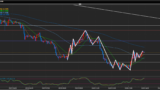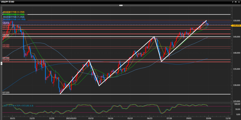 綺麗に高値安値の切り上げの形になっており上目線。150円台に乗った後は147.33円まで急下落。下位足では勢いを失っているものの、日足では上昇の流れは継続と解釈。