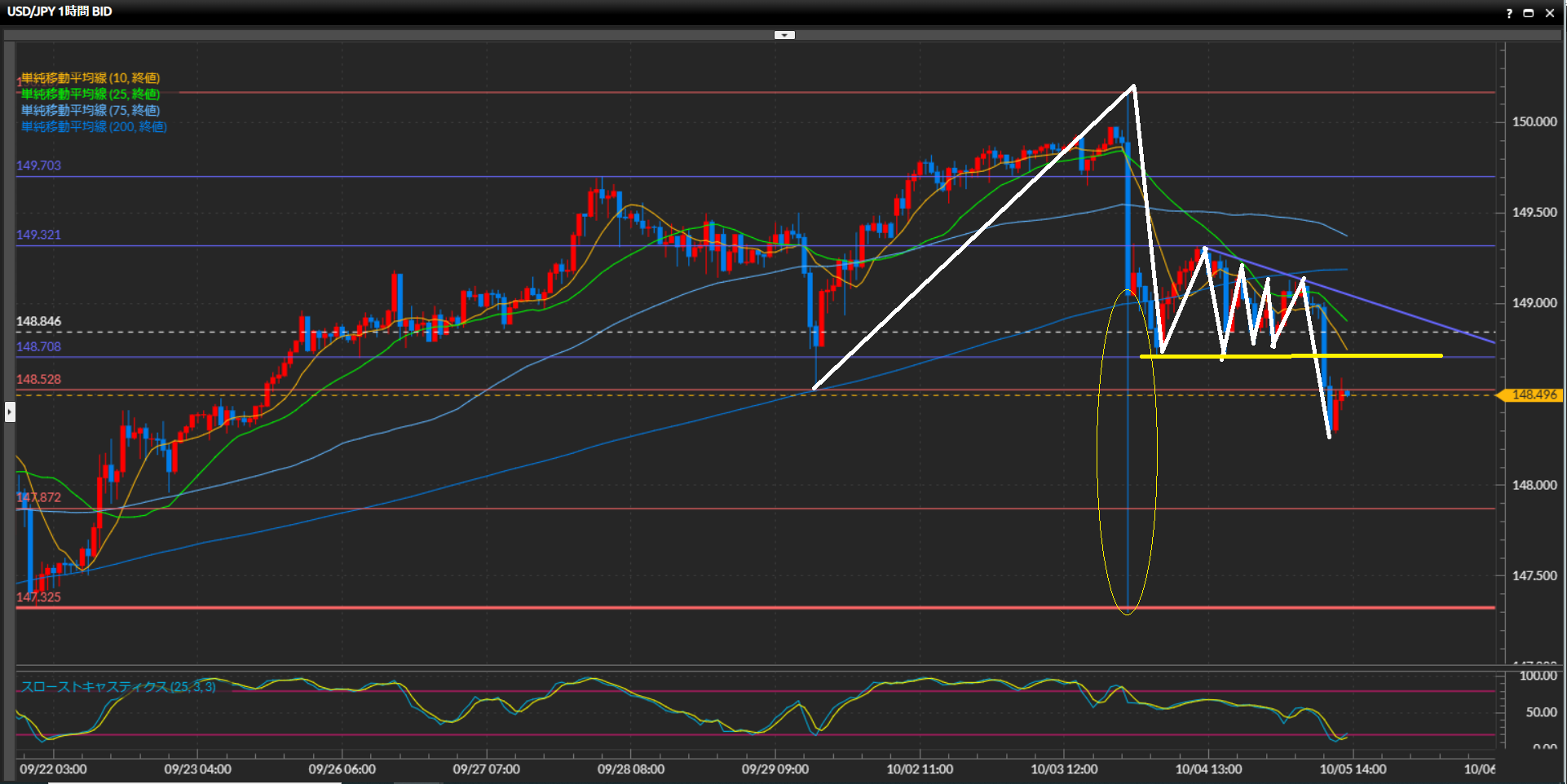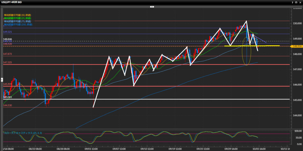 円買いフローの後に下値を支えていた水平線148.71円を下抜け確定し、高値安値切り下げの下落トレンドの形。ローソク足が75SMAをはっきり下抜けている事、10SMAと25SMAがデッドクロス事からも下方向の圧力が窺える。下値の目標は円買いフローの時にもヒゲ足でサポートされている4時間足水平線147.33円。