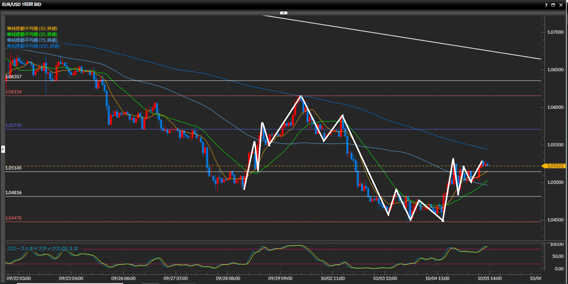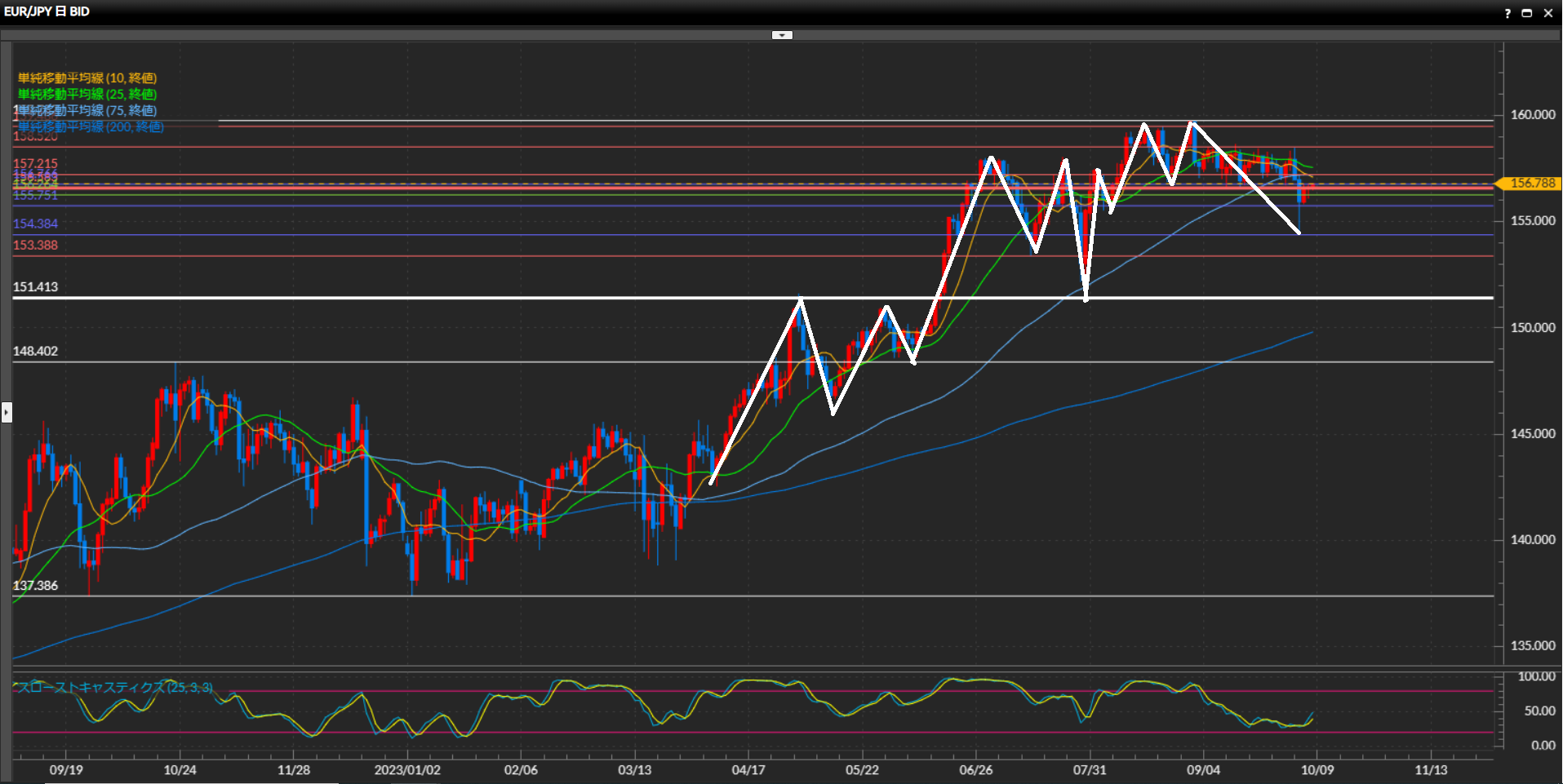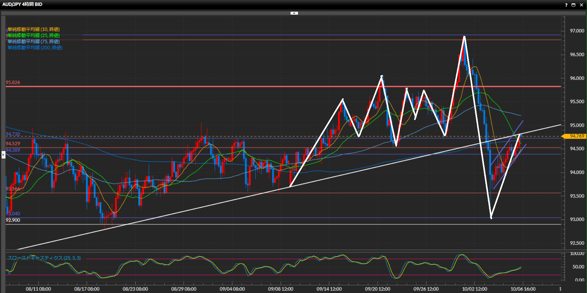 - EUR/JPYは4時間足の下目線に対し、1時間足は上目線。ドル円同様水平線の機能が弱い。