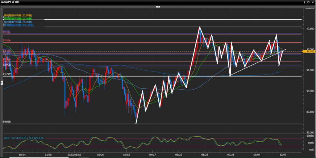 - AUD/JPYはじわじわと価格を戻す動きが続いており、日足で引いたトレンドラインがレジスタンスとして機能するかが注目。水平線の機能は弱いがSMAやボリンジャーバンドは比較的機能しており、チャートパターンを根拠にポジションを持つのはあり。上昇のチャネルラインは意識し、大きな利幅は狙わない。