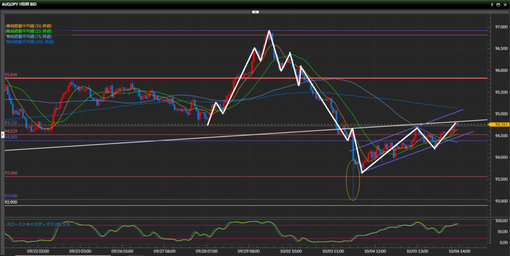円買いフロー後にじわじわと上昇中。直近高値の水平線94.73円や日足で引いたトレンドライン付近が意識されやすいので、レジスタンスされれば下目線に固定されるのでショート。SMAとボリンジャーバンドがだいぶ意識されているような印象。