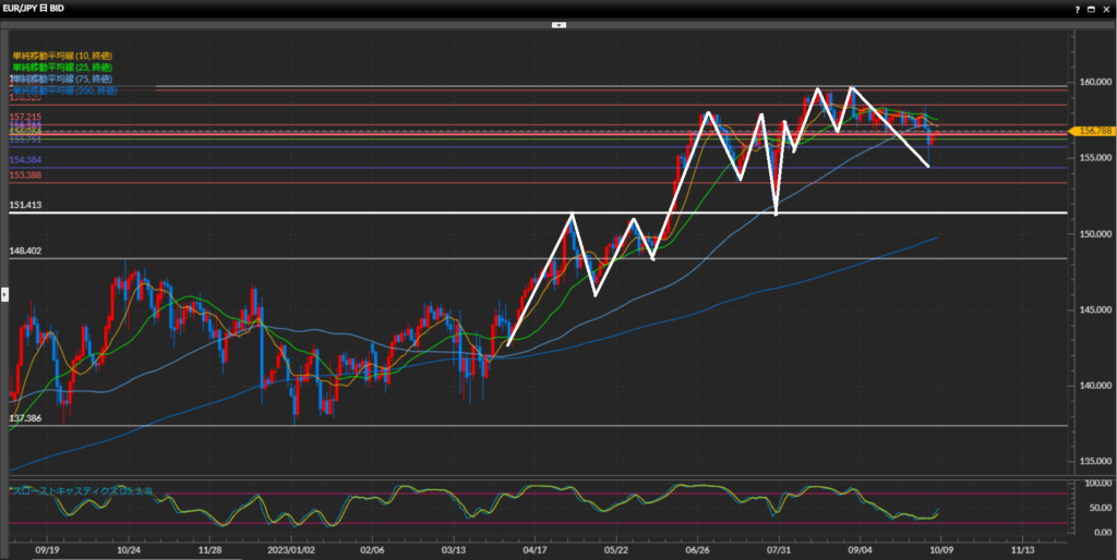大きな流れでは日足水平線151.41円を抜けない限り上目線だが、4時間足水平線156.58円を下抜け確定した事から、下値を試す動きになる可能性が高い。
