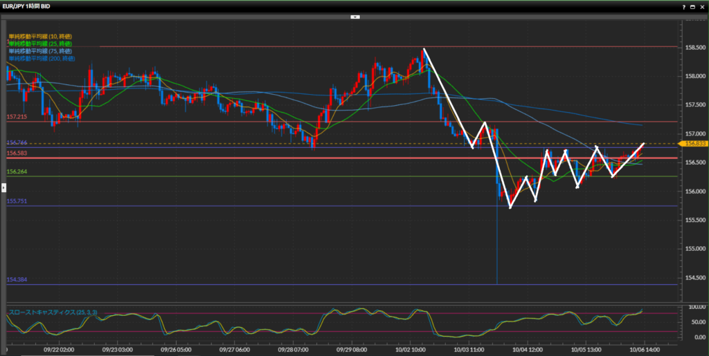 高値安値切上げの上昇トレンド。4時間足水平線156.58円を跨いで揉み合っていたが、本日正午に上抜け。上位足のSMAがローソク足の上側に多くあるため、反発するか注目。